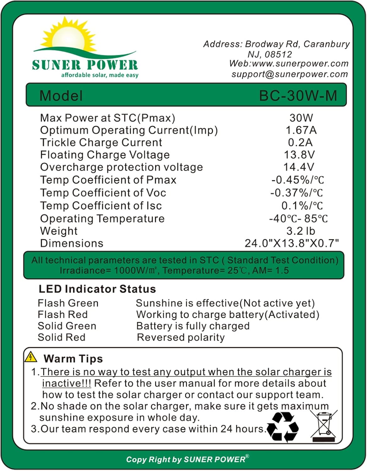 【 Smart MPPT Technology 】This 12v solar panel battery charger is crafted with SUNER POWER’s unique Ultra-Smart MPPT technology, the innovative MPPT ( Max Power Point Tracking) allows to deliver high tracking efficiency of up to 99% and peak conversion efficiency of 98%, improving approximately 20%-30% utilization rate than other competitors.