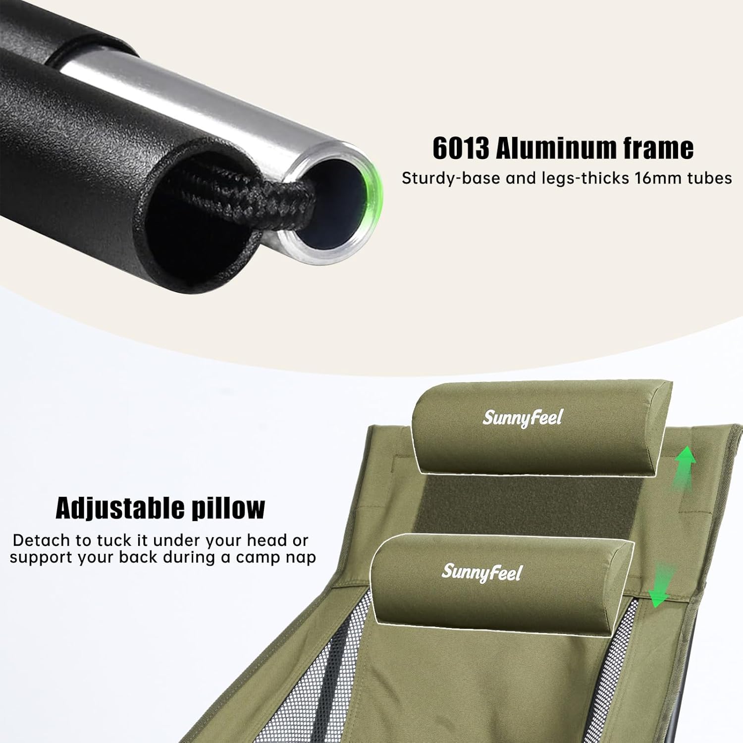 [Enhanced Comfort] The high back camping chair design provides comprehensive spinal support, and the headrest can be customized with a DIY pillow (attached with Velcro) for added comfort.