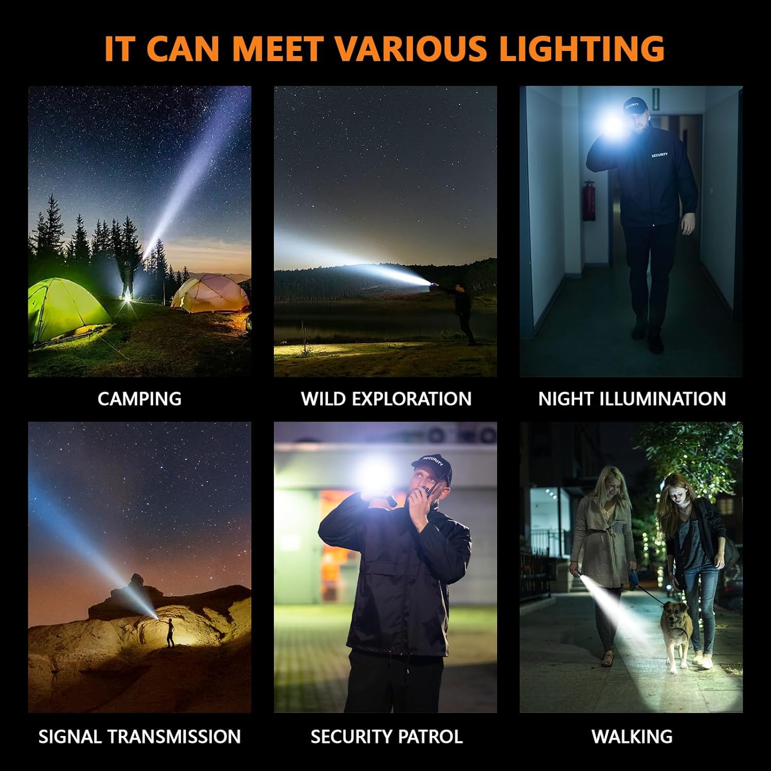 Led Flashlight with 9 Modes:This LED flashlights offers 9 modes including high brightness, medium brightness, low brightness, flashing, SOS, etc., to meet different needs. Whether camping outdoors or seeking help in a car accident, you can easily choose the appropriate light source mode. The powerful flash light head can adjust the focal length, allowing you to choose between flash light or broad lighting when needed, perfectly meeting the needs of remote and close range lighting