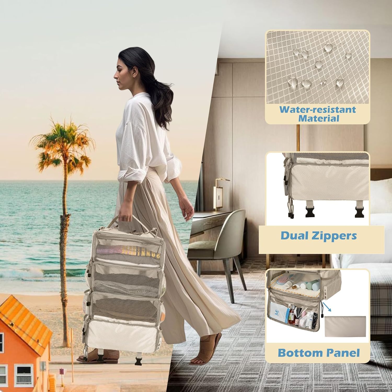The unique hanging feature allows you to suspend the cubes in a closet, bathroom hook, or even on the back of a door. This accessibility means you can instantly see and retrieve what you need without unpacking everything, making hotel living and temporary accommodations more organized.