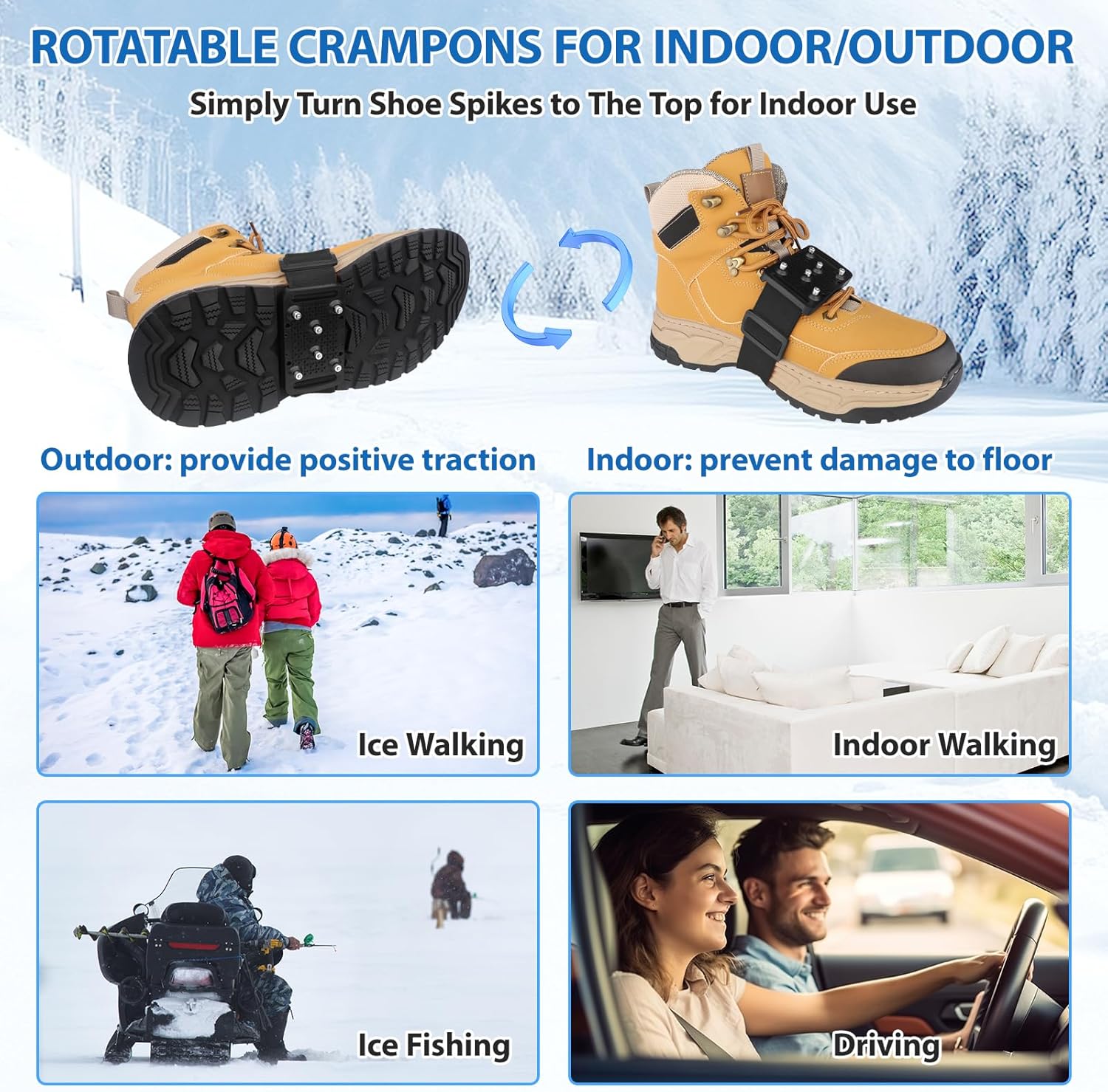 【Rotatable Design & Easy To Use】Quickly only take 10 seconds to wear on the crampons for hiking boots women men for winter boots and fasten the strap tightly when you are going to walk outside. When you are walking indoors, driving, climbing ladders, etc., just simply rotate the ice cleats onto the top of your shoes without taking a lot of effort to remove the snow cleats for shoes and boots off, and prevent spikes from damaging the floor.