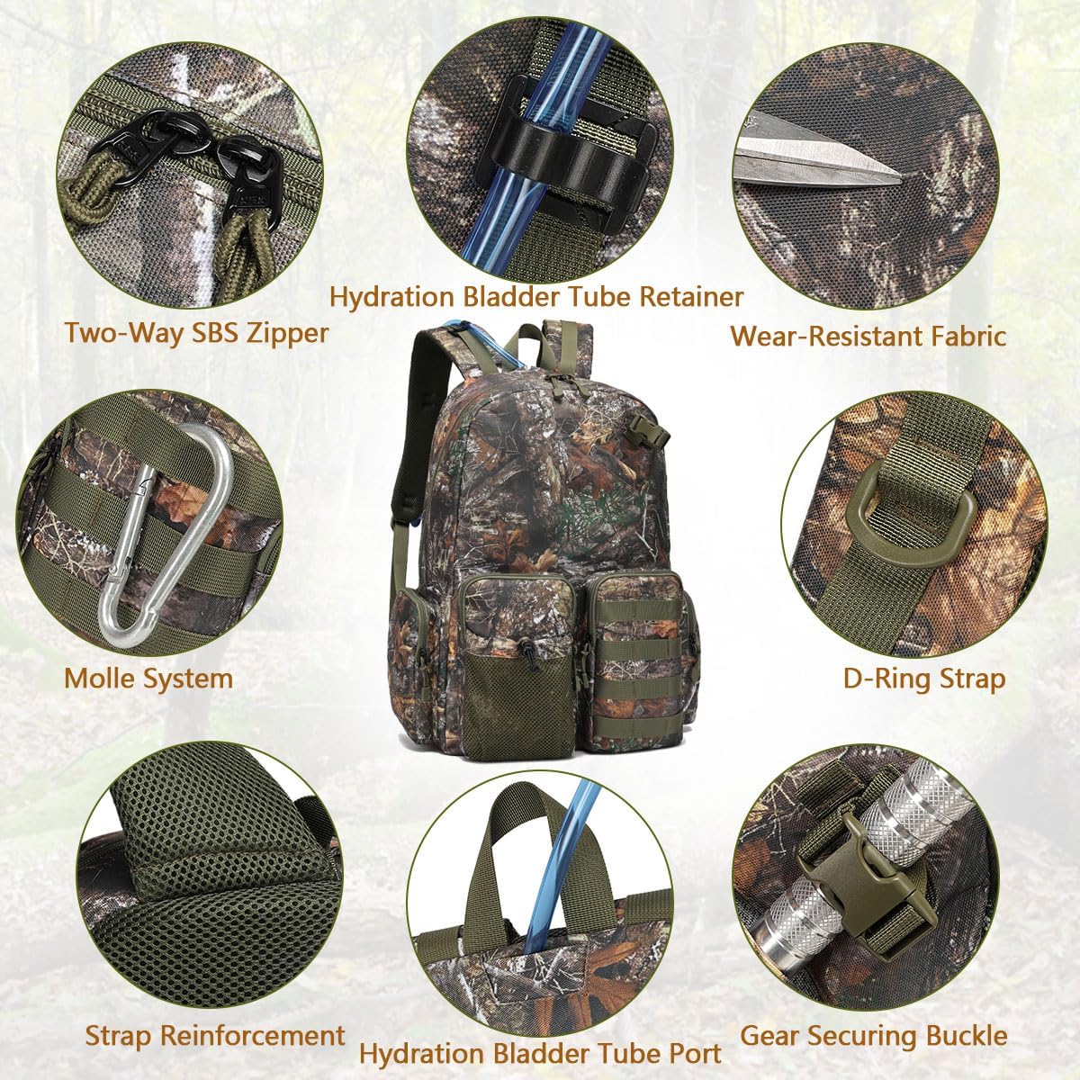 1050D high-density camo fabric undergoes 3000 steel wool abrasion tests, tougher than standard tactical bags—it stands up to thorns, rock scrapes, and sandstorms.Maximum visual concealment in woodland scenarios, reduces hunting detection probability by 65% and lets you “blend in” with natural surroundings during special reconnaissance, avoiding detection.