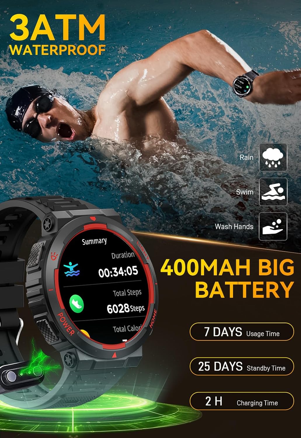 Dealark waterproof smartwatches for men fully upgraded 3ATM waterproof! It allows you to swim and dive with the smartwatch in water depths of up to 30 meters.