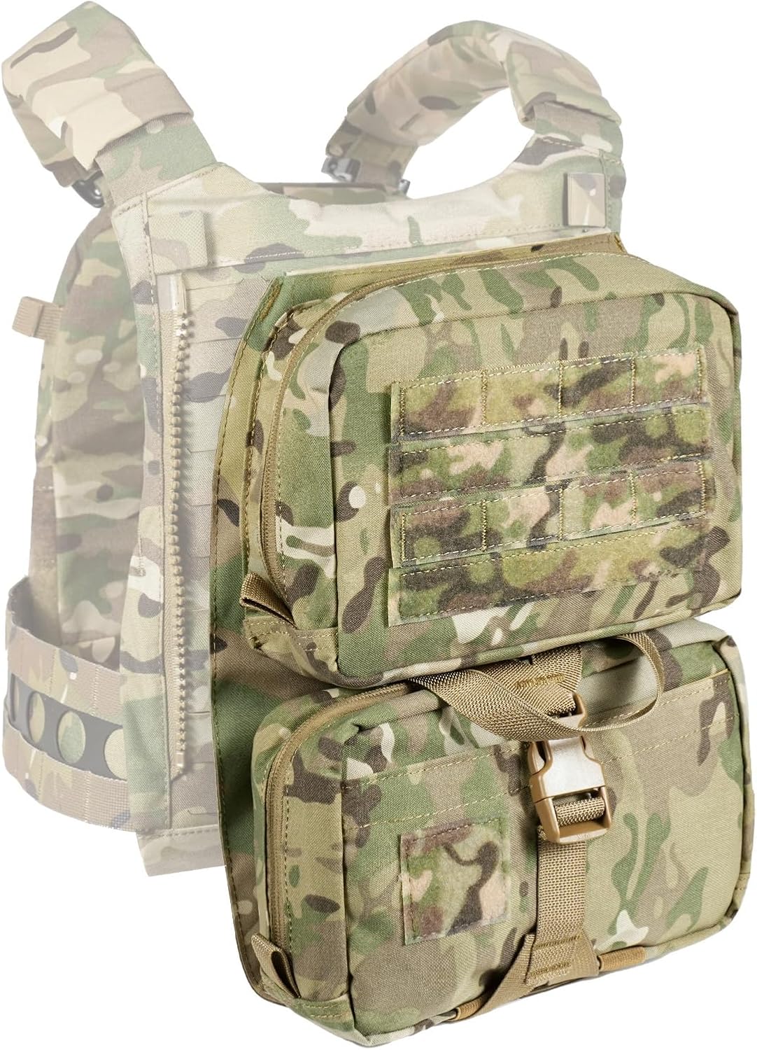 Lower pocket can be used as a first aid kit is attached with hook and loop to increase modularity and allow the user to remove it on the move.