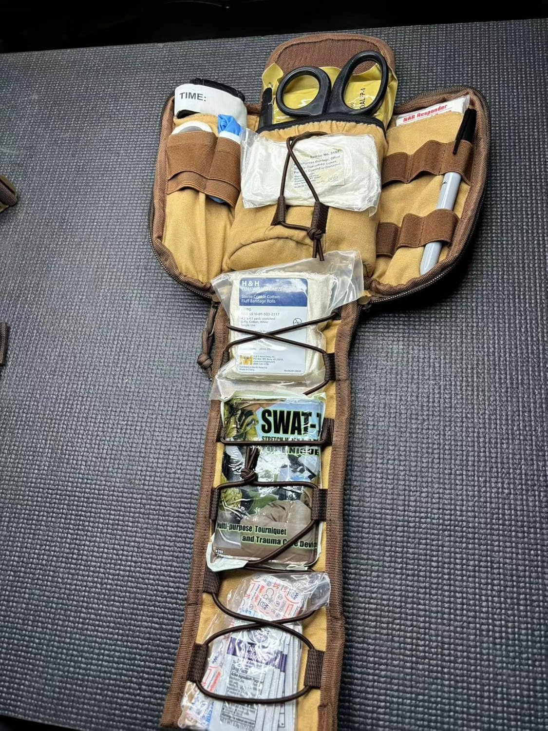 Organized Survival Kit Storage:Inside this survival kit pack, elastic holders and shock cords neatly secure medical items. Made with water-resistant nylon or waxed canvas, it protects contents from moisture and keeps gear organized and accessible