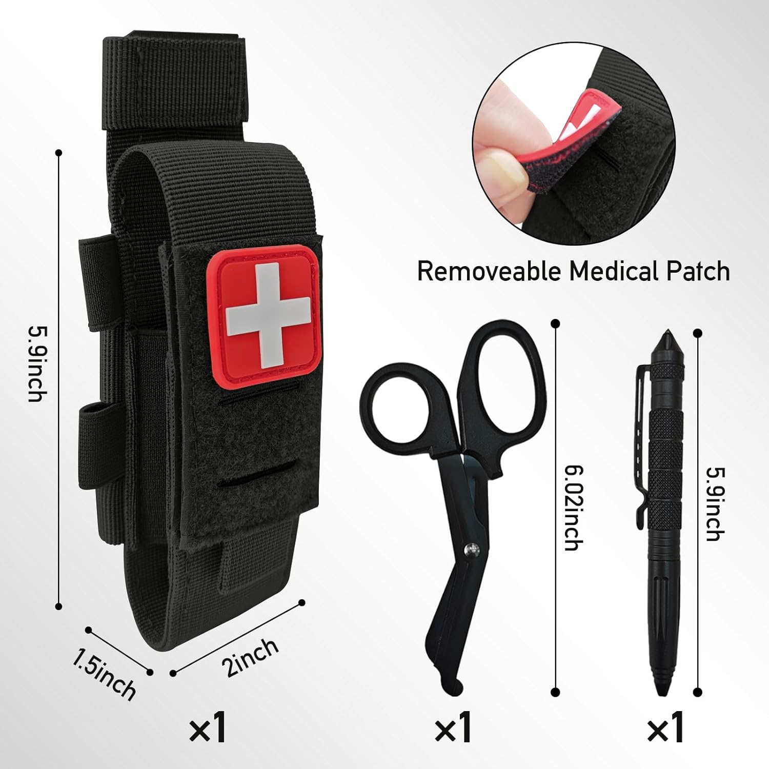 Item Include: Tourniquet Pouch, Cross Patch, Tactical Pen, Trauma Shears (Tourniquet NOT included). Precision-made, perfectly sized, and an outstanding tourniquet holder! Fits most popular tourniquets (CAT, RECON, SAM XT) with elastic sides for varying thicknesses. Holds extra hemostatic gauze; clip a knife or rescue tool to the side too.