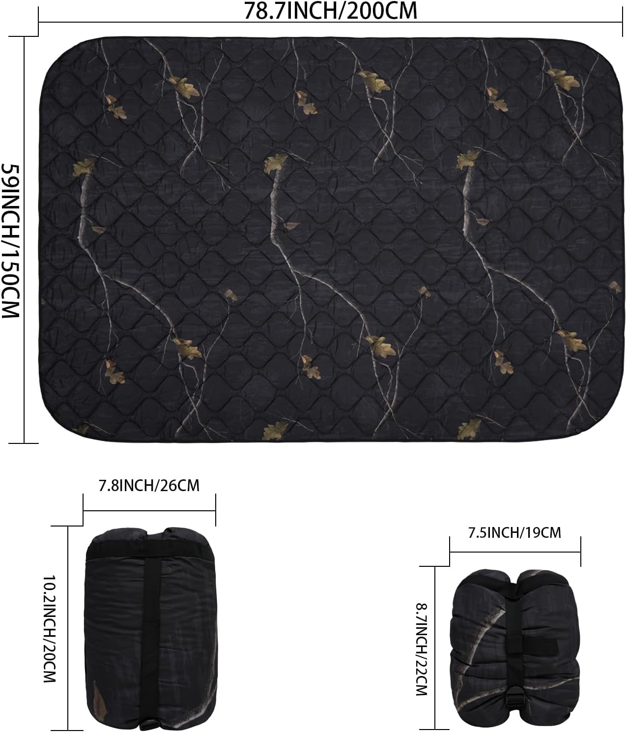 Outdoor Blanket Materials: 100% polyeter W/R ribstiop fabric with camo pattern and reinforced with wave-pattern quilting. Fill Polyester stuffing padding, warm but it breathes. Lightweight, soft and easy to pack, store, and wash. Easy to set up, put away. Fits right back into it’s carry bag with no issues.