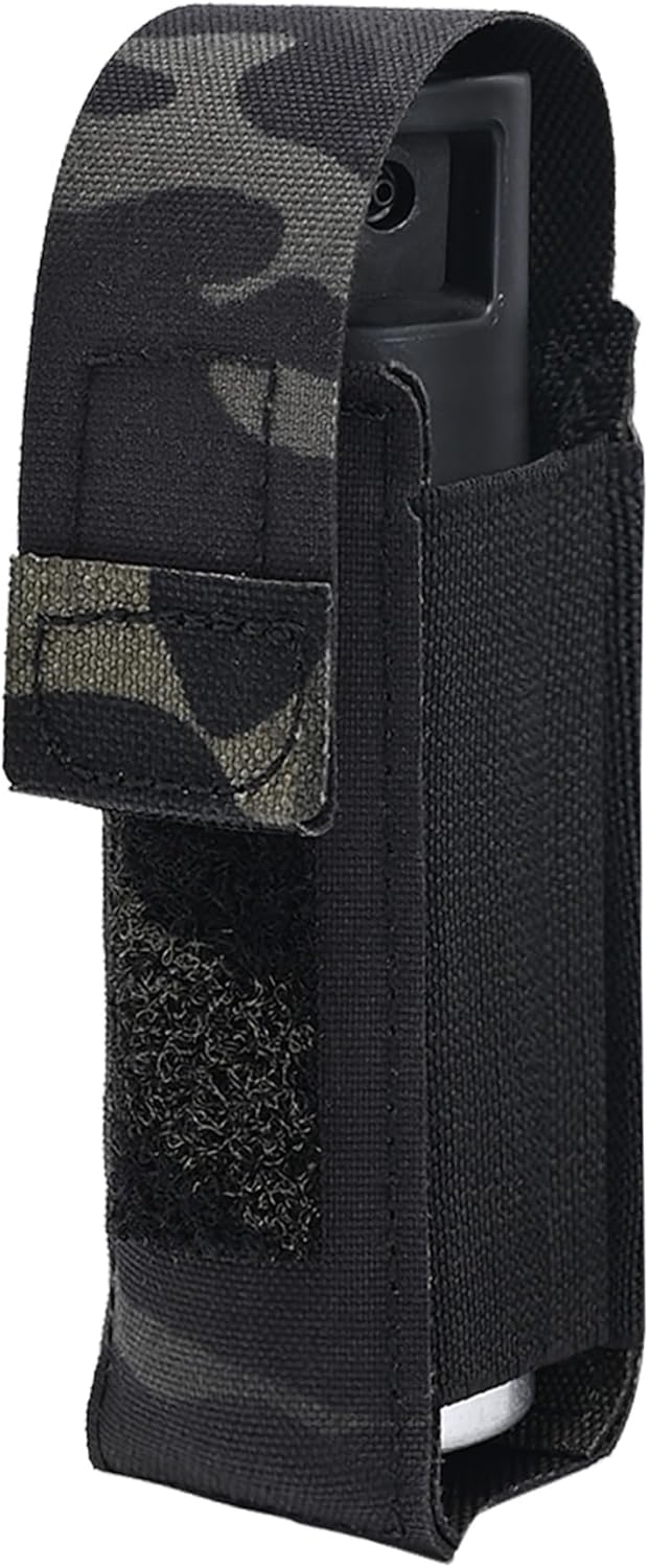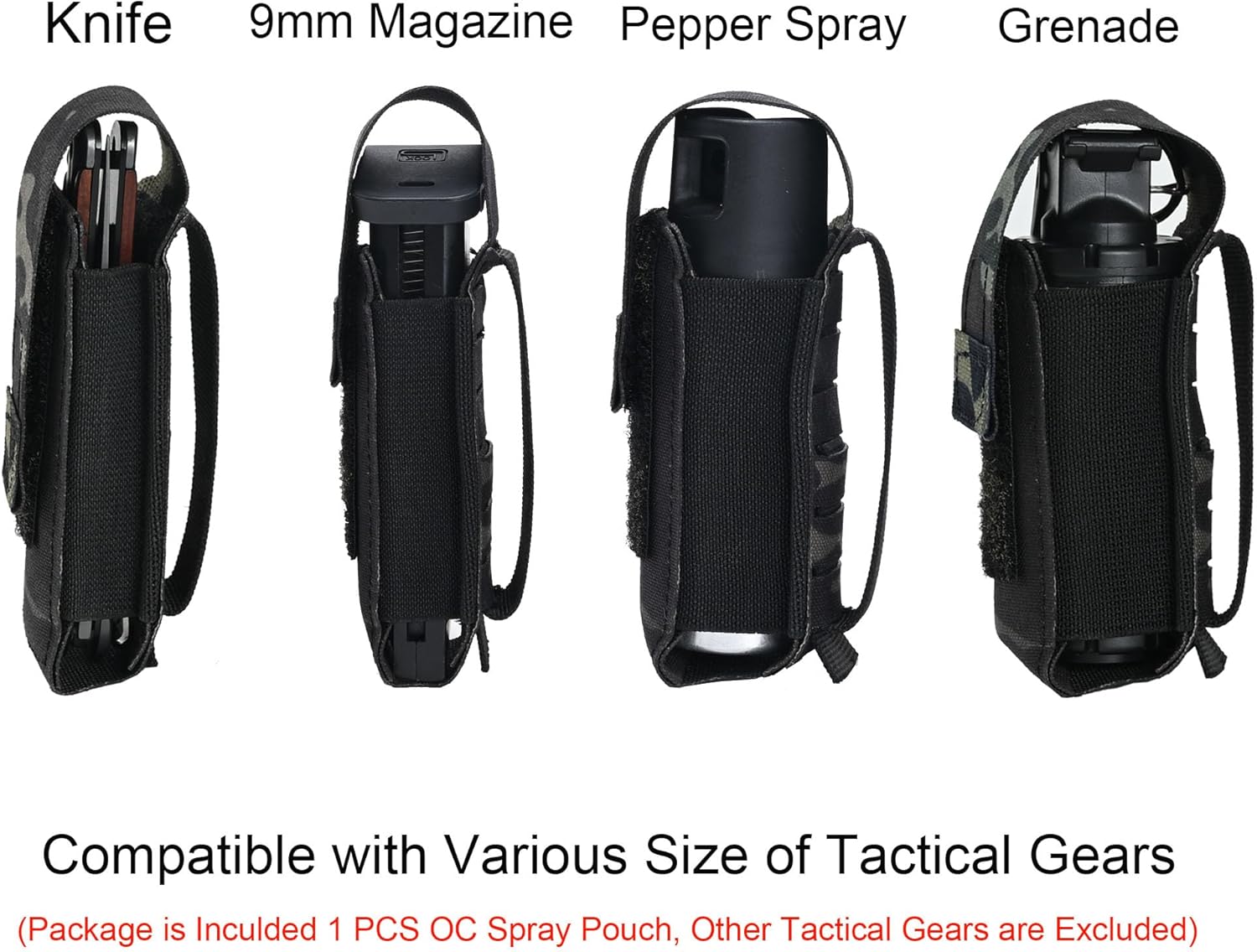 MOLLE/PALS compatible of OC pouch:MOLLE pouch has 1 webbing and 7 laser-cut slots in back.You can attach pepper sprayers to combat belts,tactical vests, and tactical backpacks.