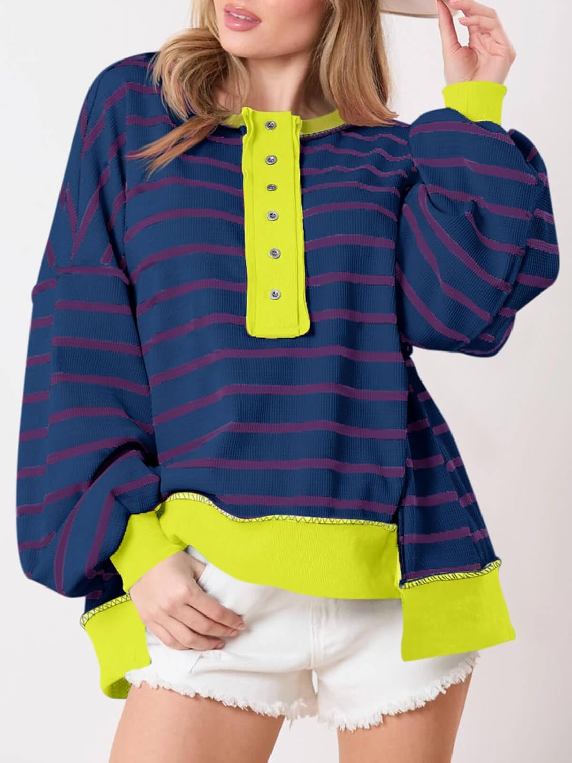 The video showcases the product in use.The video guides you through product setup.The video compares multiple products.The video shows the product being unpacked. Womens Oversized Striped Sweatshirts Henley Shirts Merchant Video
