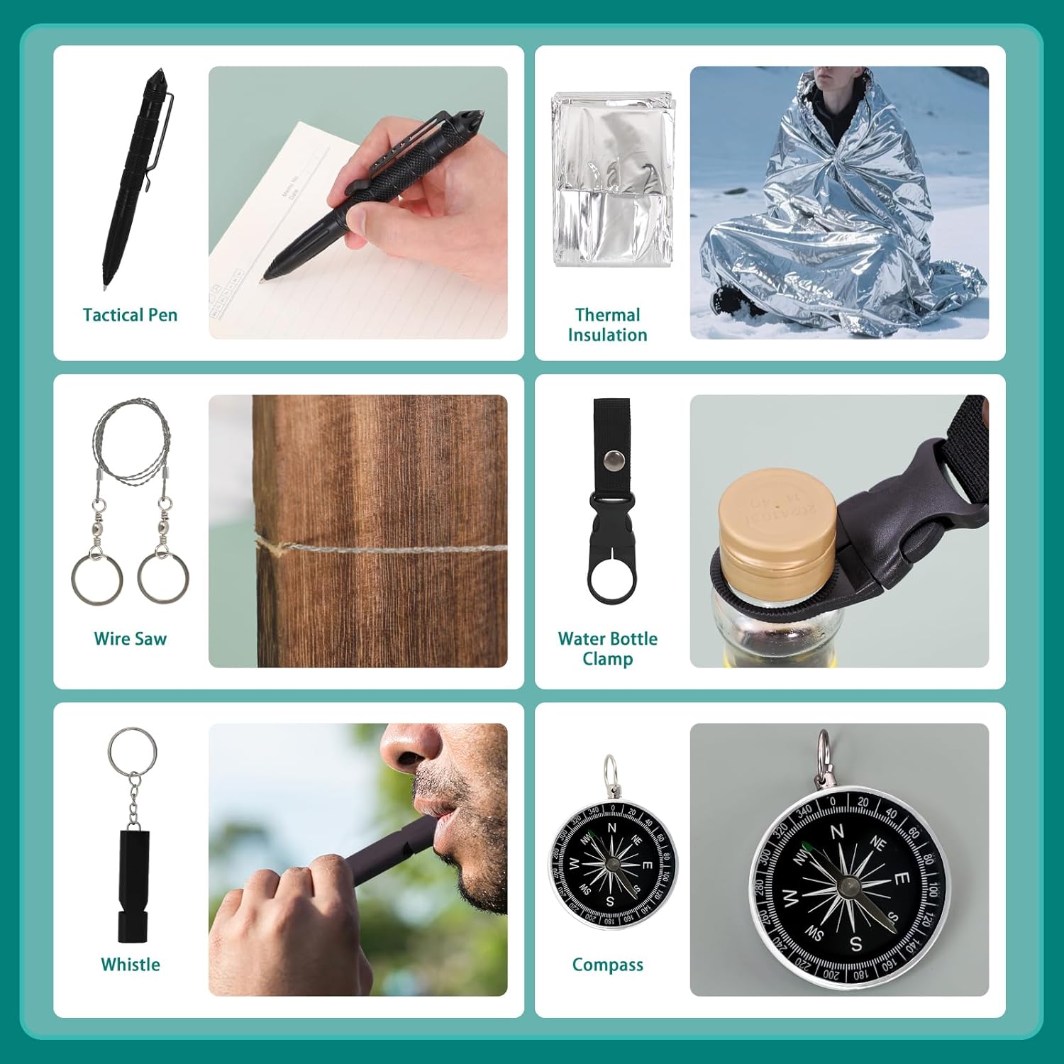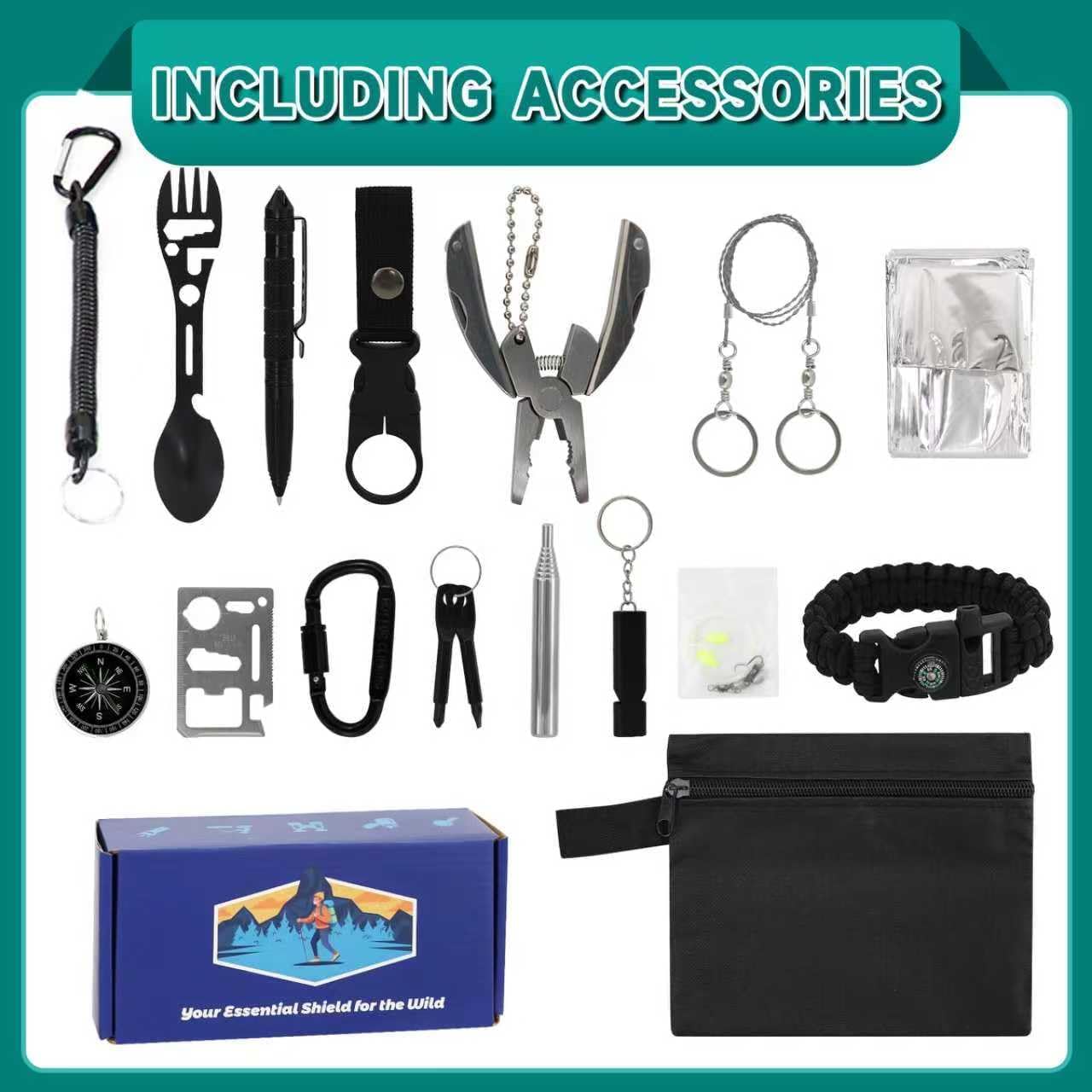 【GIFT-BOX INCLUDES】This gift set includes 1xTactical Pen,1xWire Saw,1xWater Bottle Clamp,1xEmergency Thermal Insulation Blanket,1xSurvival Bracelet,1xBlowpipe,1xStorage Hand Bag,1xScrewdriver,1xCarabiner,1xMulti-Tool Plier,1xMultifunctional Card,1xMultifunctional Spoon,1xCompass,1xWhistle,1xFishing set,1xKey Chain.We had such a positive response from this teen boy gift box, these items bring him many fun, We truly hope your little boys love this gift.