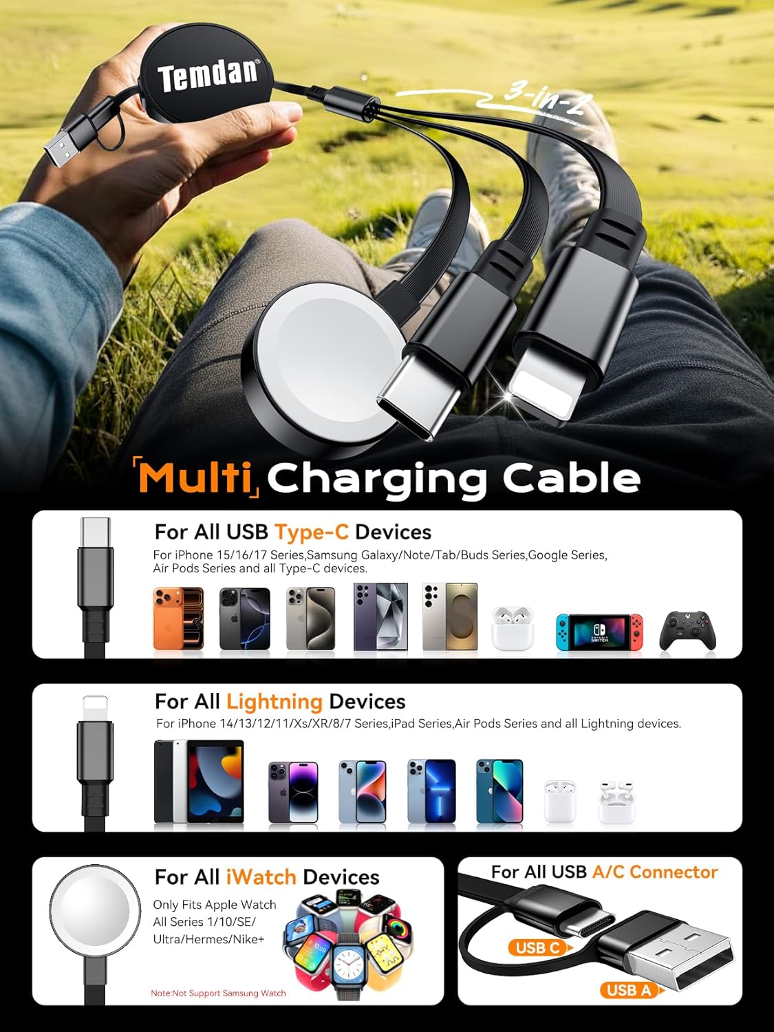 All-in-One Retractable Car Charger: This all-in-one cable integrates a USB-C , Apple Watch Charger, and Lightning connector to easily charge all your devices. Please note: This cable is designed for charging only and does not support data transfer