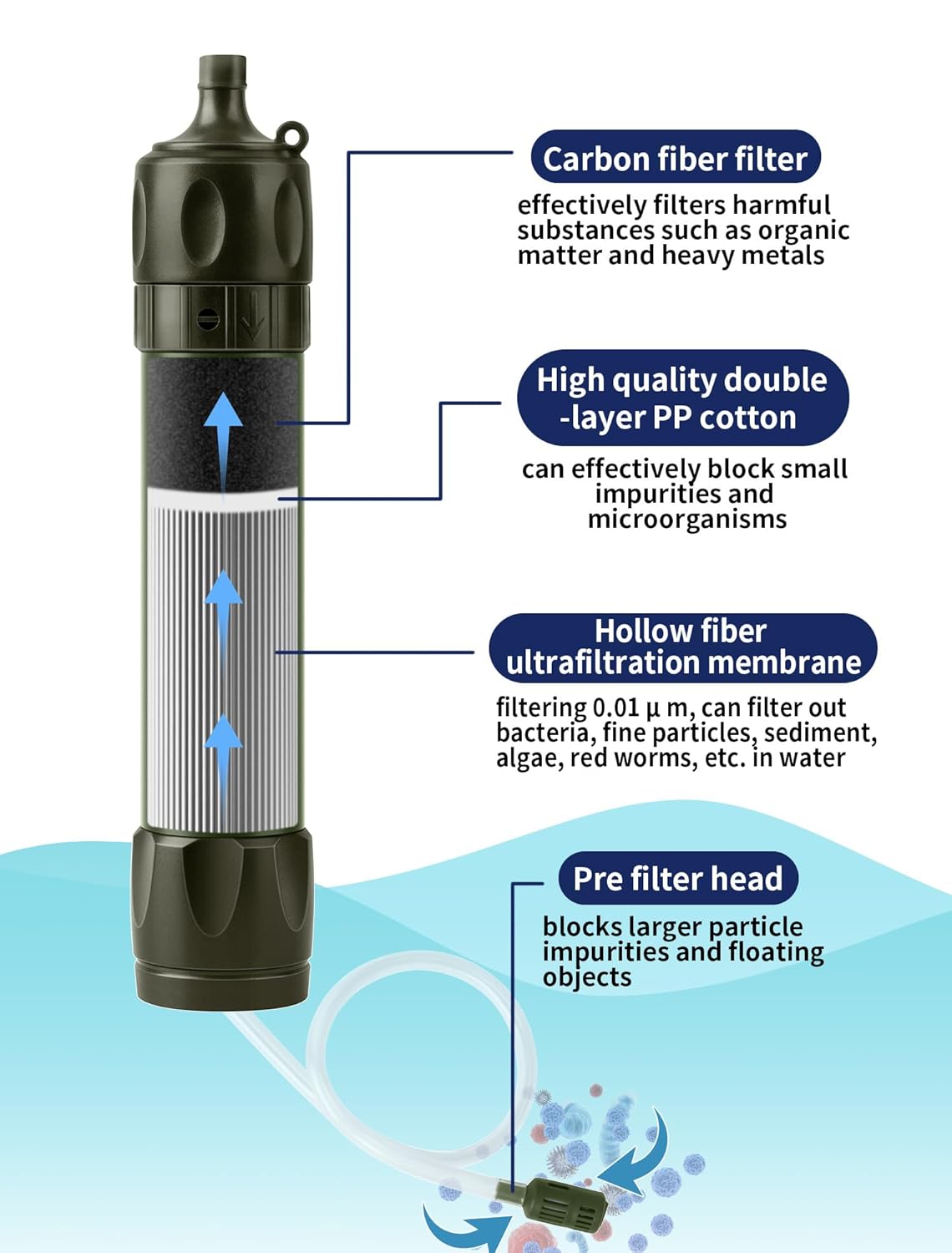 [Advanced 0.01-Micron Filtration for Clean, Great-Tasting Water]Features a 3-stage filtration system (Hollow Fiber Membrane, Carbon Fiber, PP Cotton) with 0.01-micron precision to reduce sediments and particles. The carbon fiber layer effectively improves water taste, making natural water sources taste clean and fresh during hiking and backpacking.