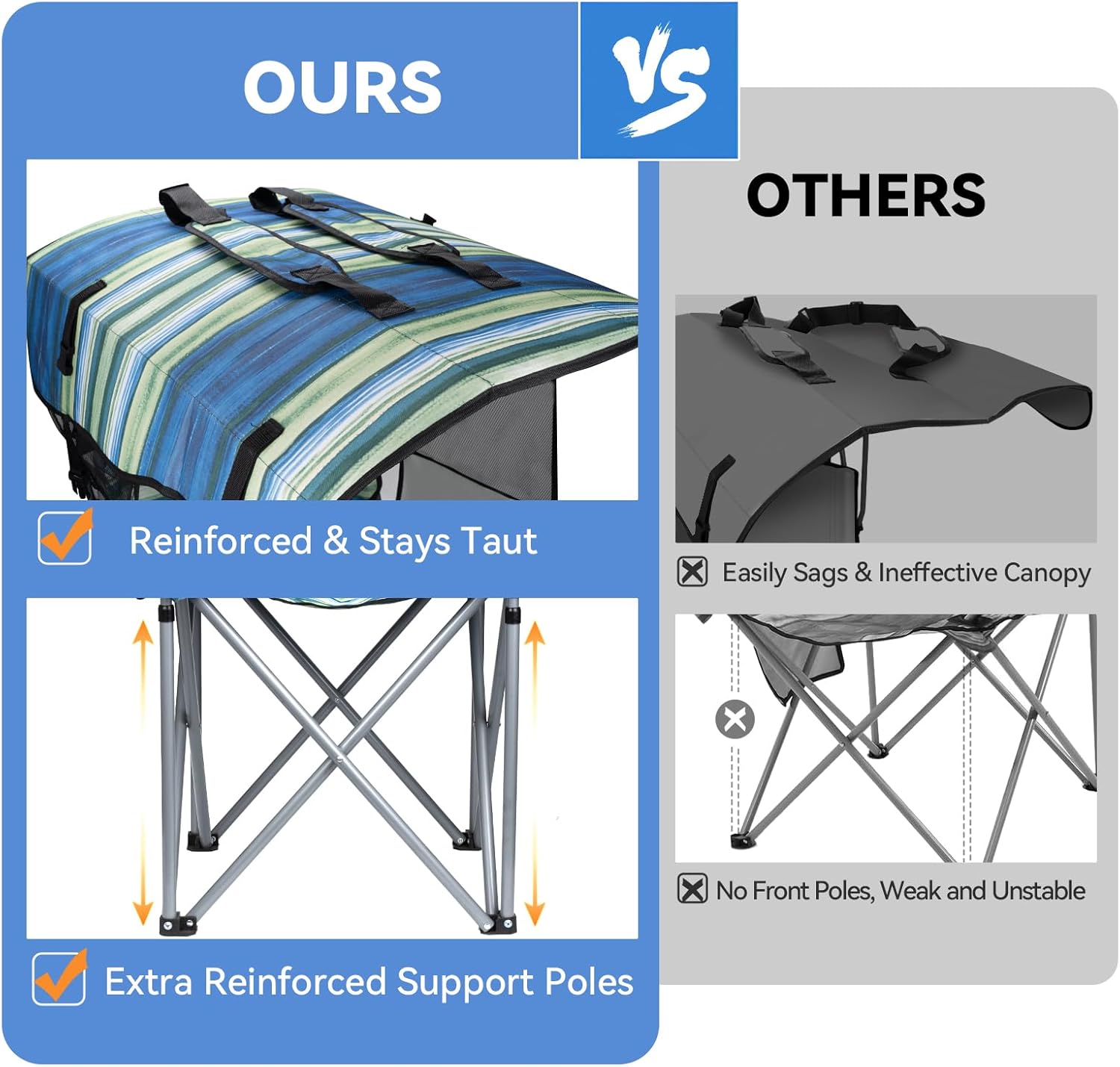 Upgraded Canopy with Built-in Support: Our camping chair features a reinforced canopy with an internal support layer that prevents sagging or collapsing. Extended side shades and a rear flap offer multi-angle sun protection, keeping you cool and covered from every direction. Built for durability and comfort, this upgraded design ensures stable shade during any outdoor adventure