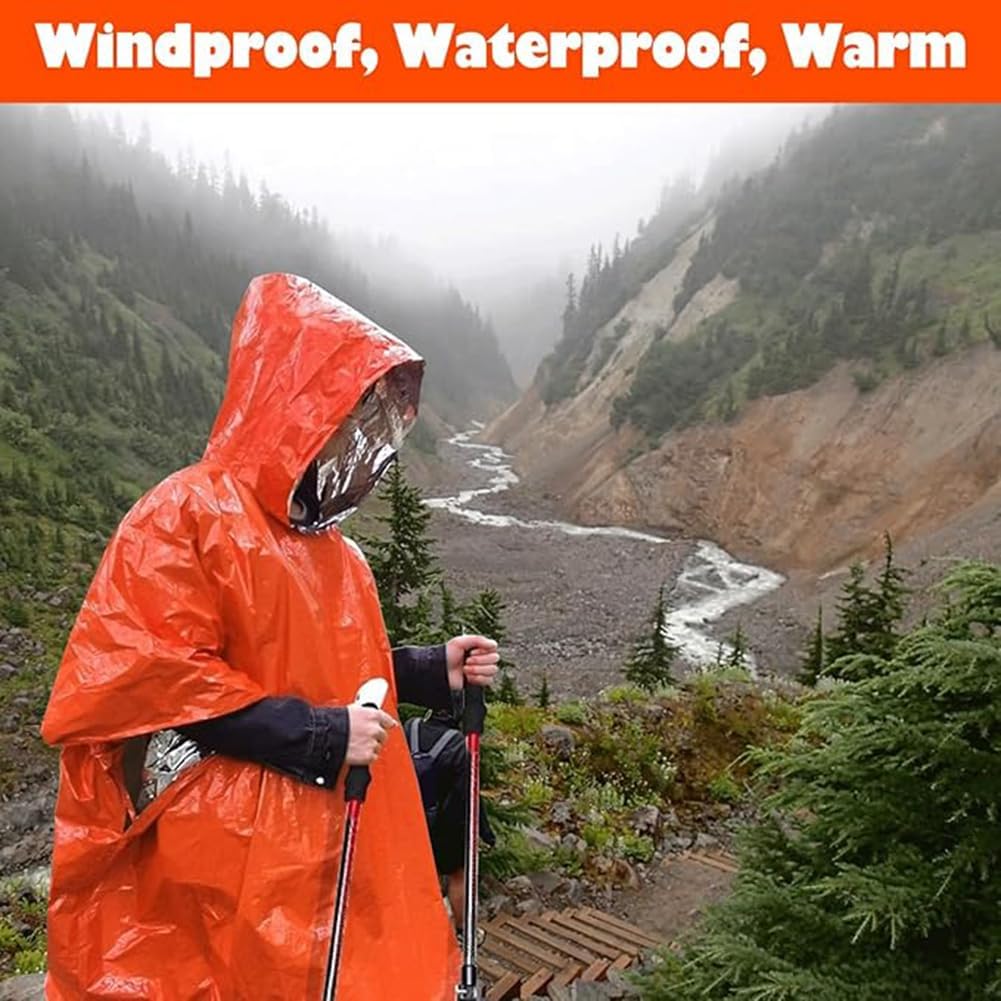 REVERSIBLE AND PORTABLE – Unlike other emergency blankets, this poncho is double-sided: the orange side retains your body heat while the silver side can be used for sun protection and signal reflection to get yourself noticed from a long distance. Weighing just 80g/3oz and measuring 100*130cm/39”x51”, this hooded blanket is lightweight and compact, so you can easily pack it as a survival kit for concerts, first aid, running, camping, hiking, fishing, kayaking and other outdoor activities.
