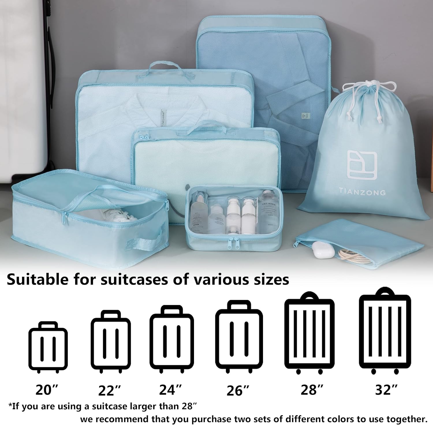 7-piece set:2 Large Cubes + 1 Medium Cube + 1 Small Cube or 1 Toiletry Bag +1 Zipper Pouch + 1 Double Layer Shoe Bag + 1 Drawstring Bag