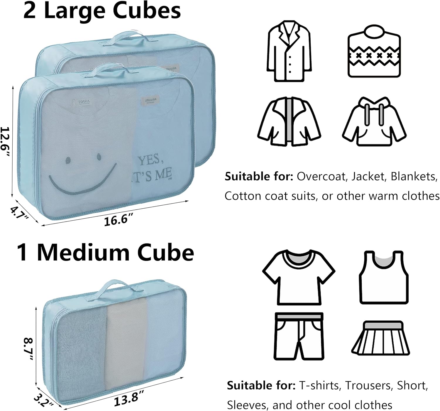 Each travel cube is a separator in your suitcase so no more searching for misplaced items or wasting time packing and repacking.