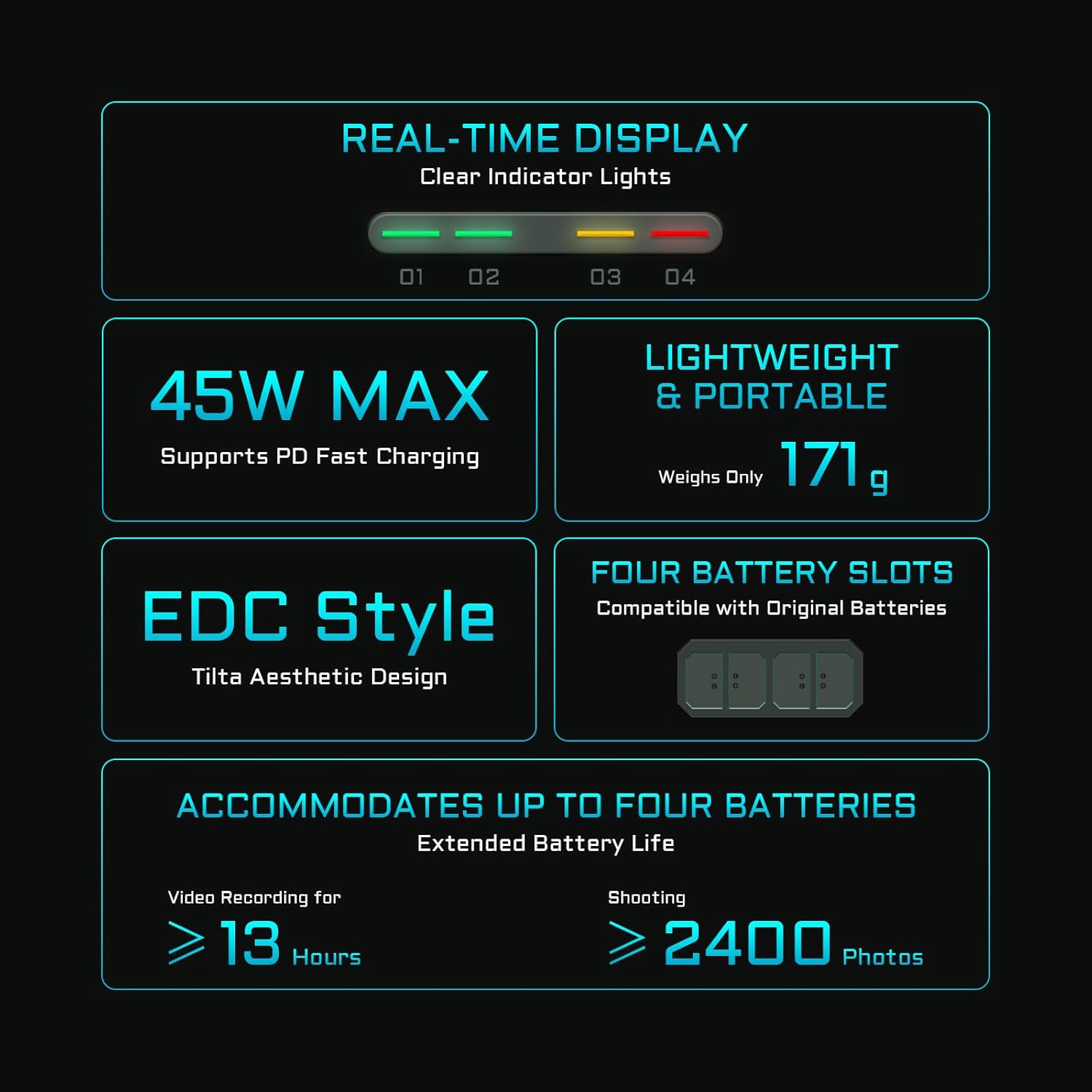 Supports simultaneous charging of four batteries, with a total charging power of up to 45W (Must use 45W+ PD Charger & compatible cable for high speeds).