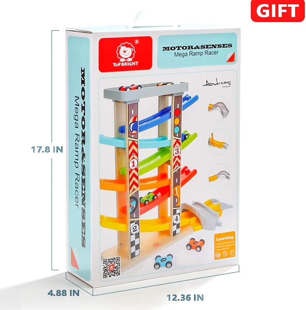 Top Bright wooden car ramp racer with 6 mini cars is specially designed for developing kid’s brain Natural observation Space intelligence Body movement