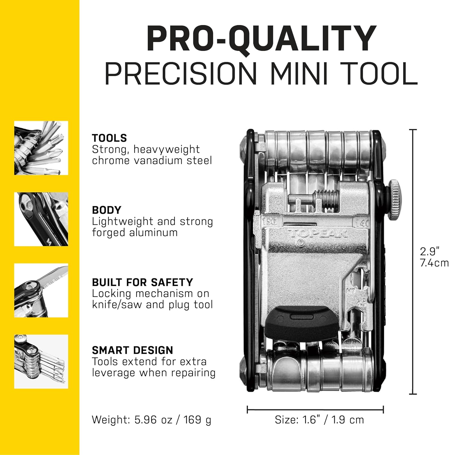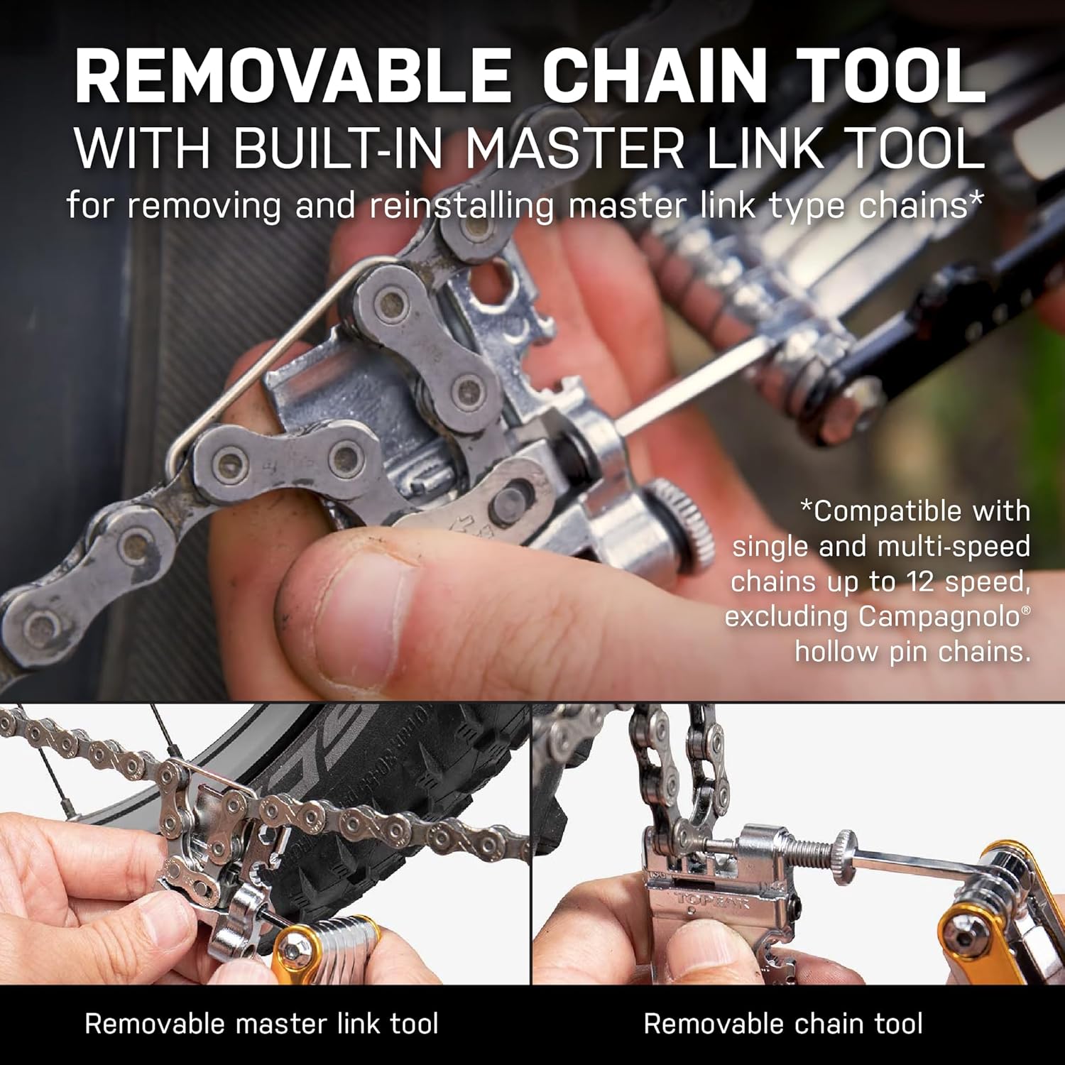 Comprehensive 30-Function Tool: Includes hex (2L–8 mm), Torx (T10–T25), screwdrivers, spoke wrenches, chain tool, tire plug tools, and serrated knife