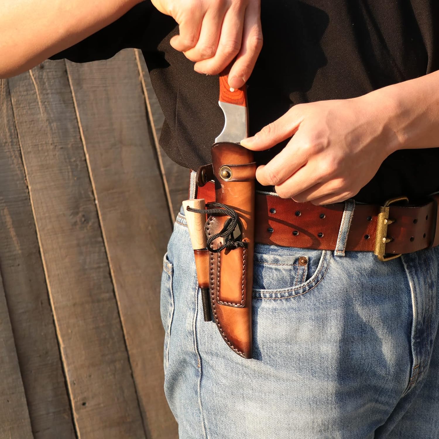 Leather case is perfect for vertical carry on a belt or strap. Survival Knife case with Fire Starter loop, BUT Fire Starter is not included.