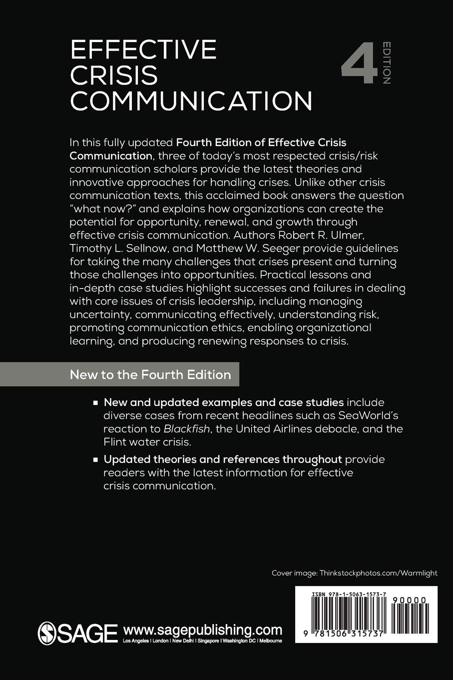 In this fully updated Fourth Edition of Effective Crisis Communication, three of today’s most respected crisis/risk communication scholars provide the latest theories and innovative approaches for handling crisis. Unlike other crisis communication texts, this acclaimed book answers the question, “what now?” and explains how organizations can create the potential for opportunity, renewal, and growth through effective crisis communication. Authors Robert R. Ulmer, Timothy L. Sellnow, and Matthew W. Seeger provide guidelines for taking the many challenges that crises present and turning those challenges into opportunities. Practical lessons and in-depth case studies highlight successes and failures in dealing with core issues of crisis leadership, including managing uncertainty, communicating effectively, understanding risk, promoting communication ethics, enabling organizational learning, and producing renewing responses to crisis.