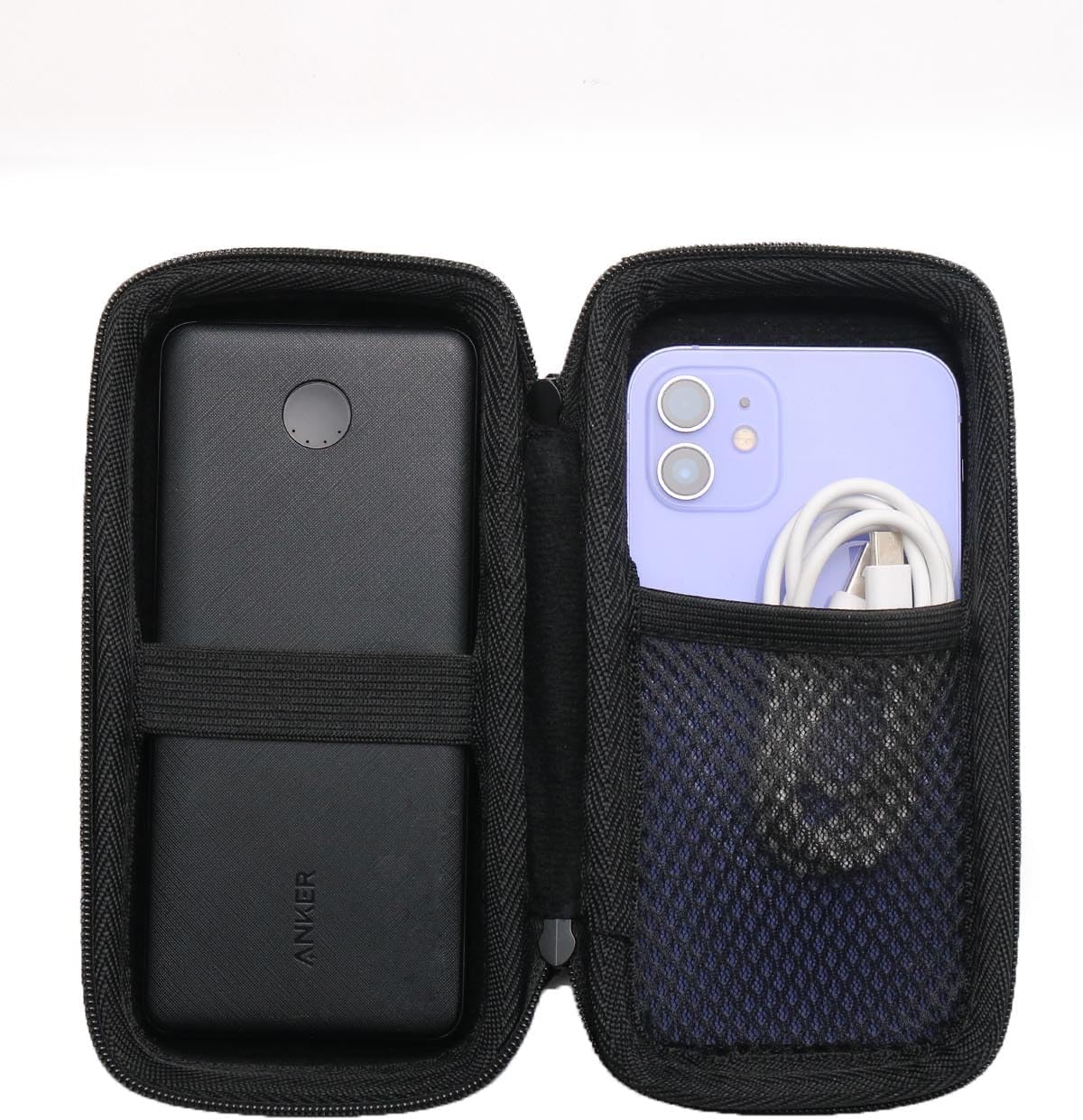 In the bottom room, hold power bank with elastic band. In the top mesh pocket storage,cable,charger,earphone and other accessories. Smooth and rigid 360-degree zipper is easy to open and close. Case with sturdy hand strap makes it easy to carry.