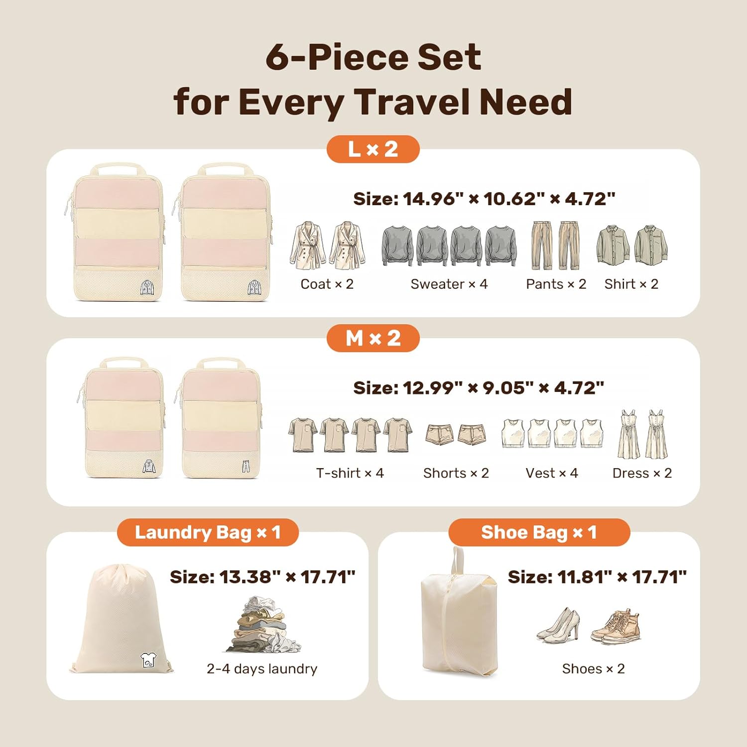Ultimate All-in-One Packing Solution: Keep your suitcase neat and organized! This 6-pack compression packing cube set includes 2 large cubes (27×39cm) for jackets and sweaters, 2 medium cubes (35×23cm) for shirts and pants, 1 drawstring laundry bag for dirty clothes, and 1 shoe bag (30×45cm) to keep shoes separate. Unlike others with one large cube, our set offers double the capacity. Use them to separate family members’ clothing or categories, making packing and unpacking effortless on the go.