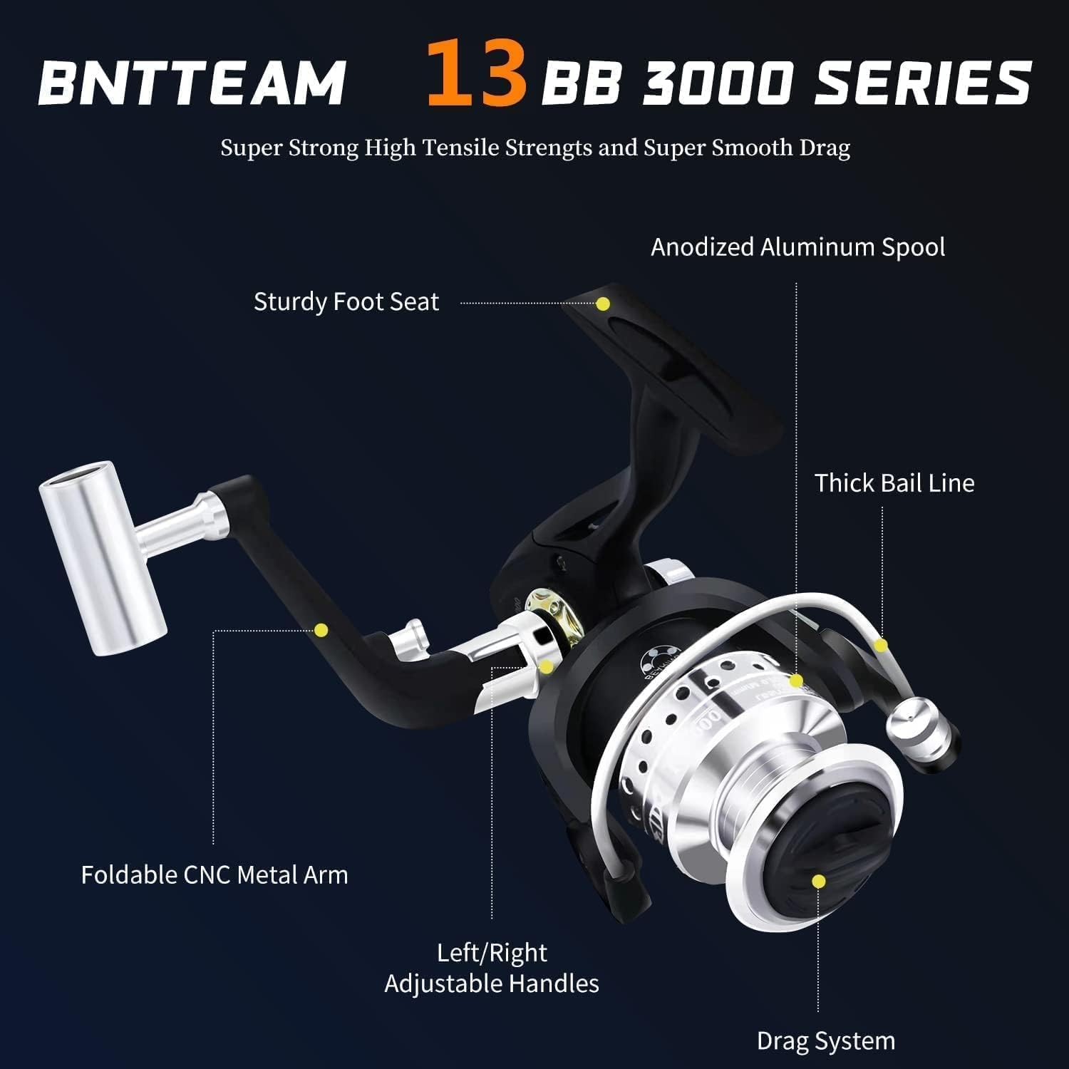 Spinning Fishing. Material: P66&Metal Body.Ball Bearing: 13BB 3000 size.SMOOTH Gear Ratio: 5.2:1 Weight: about 280g, It is fortified with metal main shaft and components and equipped with 13 ball bearings.