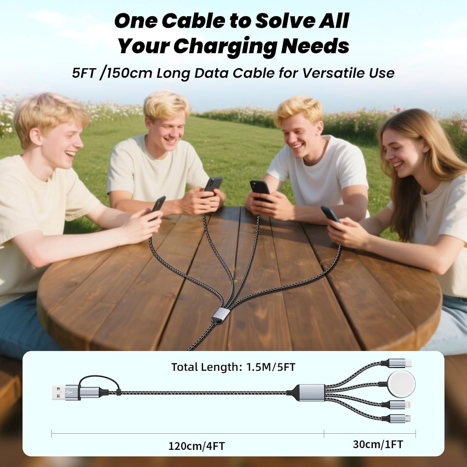 【4-IN-2 MULTI CHARGING CABLE – ALL-IN-ONE TRAVEL SOLUTION】 Combining USB A and USB C input with Lightning, USB-C, Micro-USB and iWatch magnetic charger outputs, this versatile 4-in-2 universal charger cable powers multiple devices at once—ideal for iPhone 17–11, iWatch Ultra/SE/10–2, iPad, and Android. One cable covers all your charging needs,perfect for family sharing or multi-device users,no more outlet hogging or cable clutter.