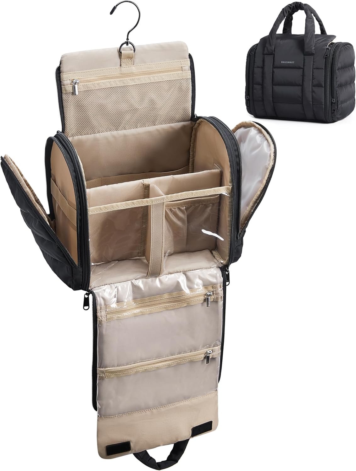 Effortless Visibility & Access: Wide-opening design + transparent zippered pockets provide clear visibility and easy access to your items. Features smooth-gliding dual metal zippersand a 360° swivel hook—hang anywhere (towel racks, doors, hooks) to free up counter space