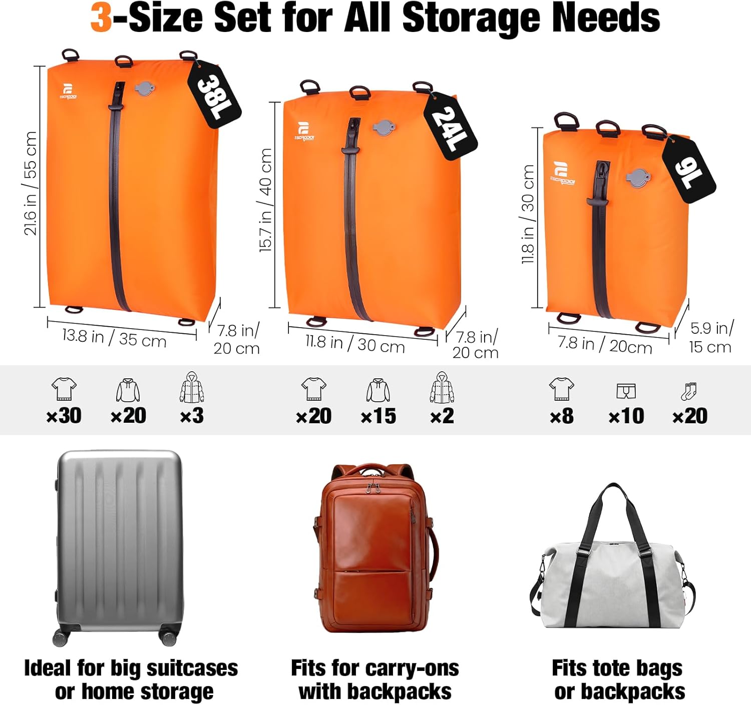 【Triple Your Packing Space】The travel vacuum seal bags for clothing could reduce bulky clothing volume by over 60% to maximize suitcase capacity and keep your packing neat and organized. The 3-bag set fits perfectly in carry-ons, large backpacks, tote bags, and checked luggage.