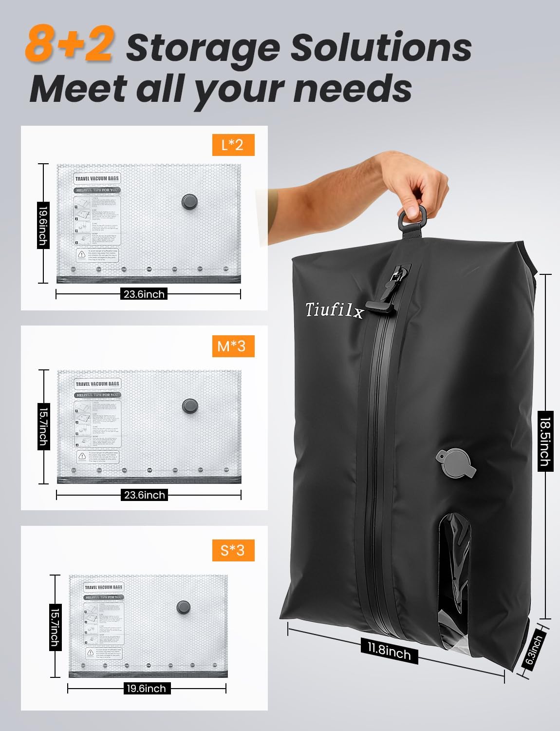 Smart 8+2 Bag System with Visible Organization; Organize efficiently with 8 transparent vacuum seal bags for clothing travel in three optimized sizes (19.6×15.7in, 23.6×15.7in, 23.6×19.6in) plus 2 heavy-duty 17L TPU bags with viewing windows. This versatile set of space saver vacuum storage bags reduces luggage volume by up to 80% while maintaining clear visibility and protection for various storage needs.