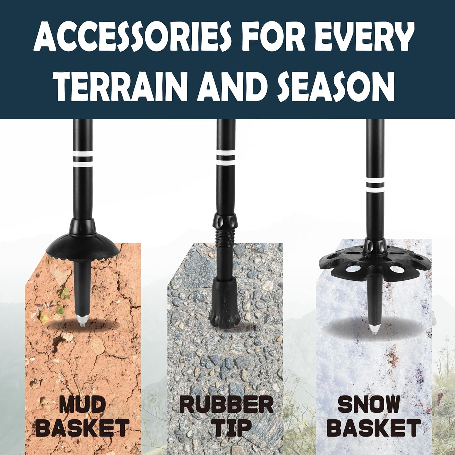 Suitable for All Road Conditions: The shoe-shaped feet of the tip pack provide increased surface area for touching the ground, making it great for use on all kinds of road conditions. The standard mud/snow baskets also prevent the hiking poles from sinking into mud or snow.