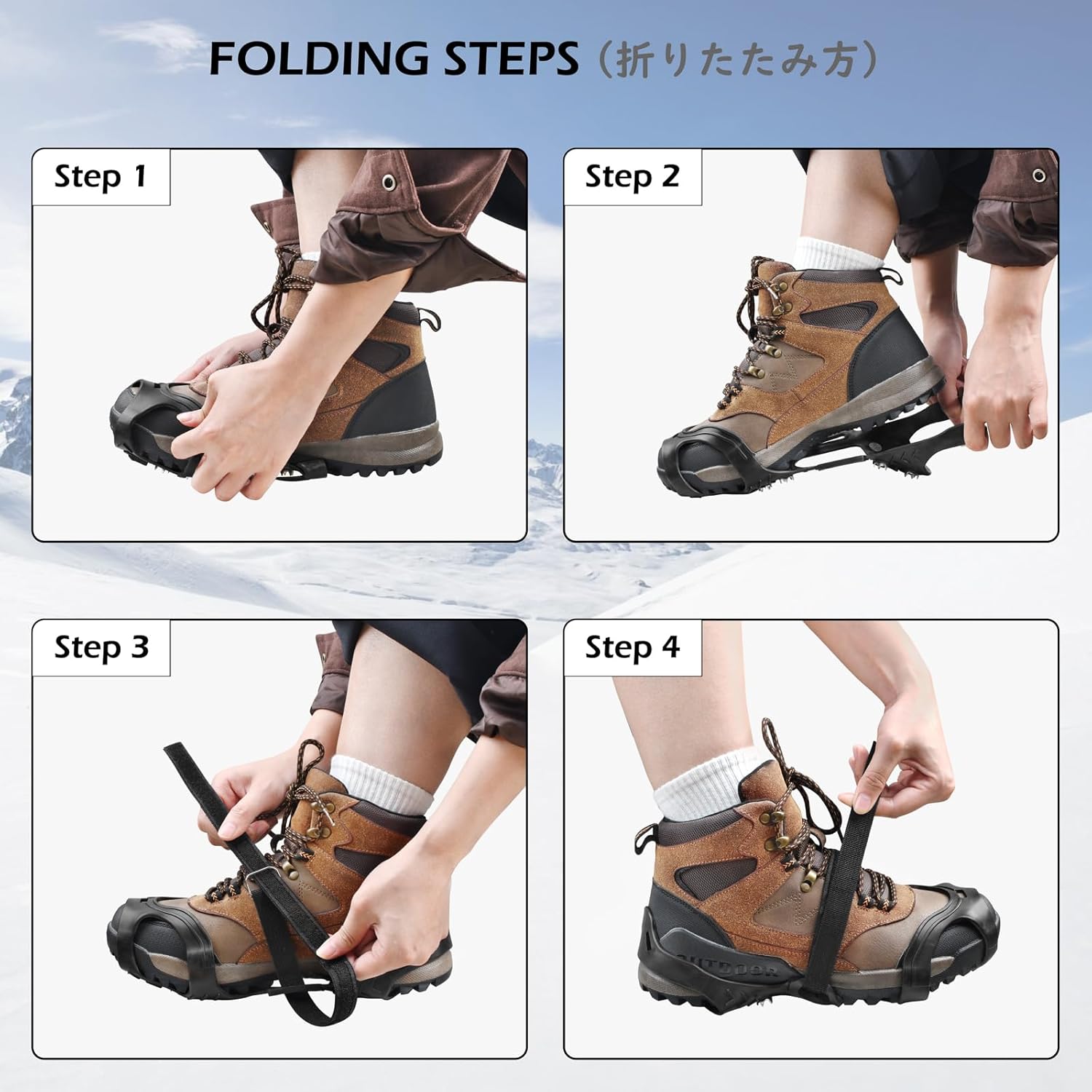1. Attach the ice cleats to your shoes, starting with the front and then securing the back.