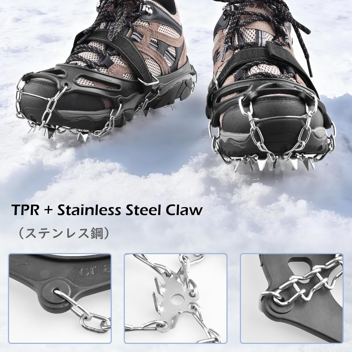 Stainless Steel Spikes: Heat-treated stainless steel spikes with reinforced chains provide excellent traction on icy, snowy, and slippery surfaces; 8, 13, 18, or 24 spikes per foot help reduce slipping and keep you safe