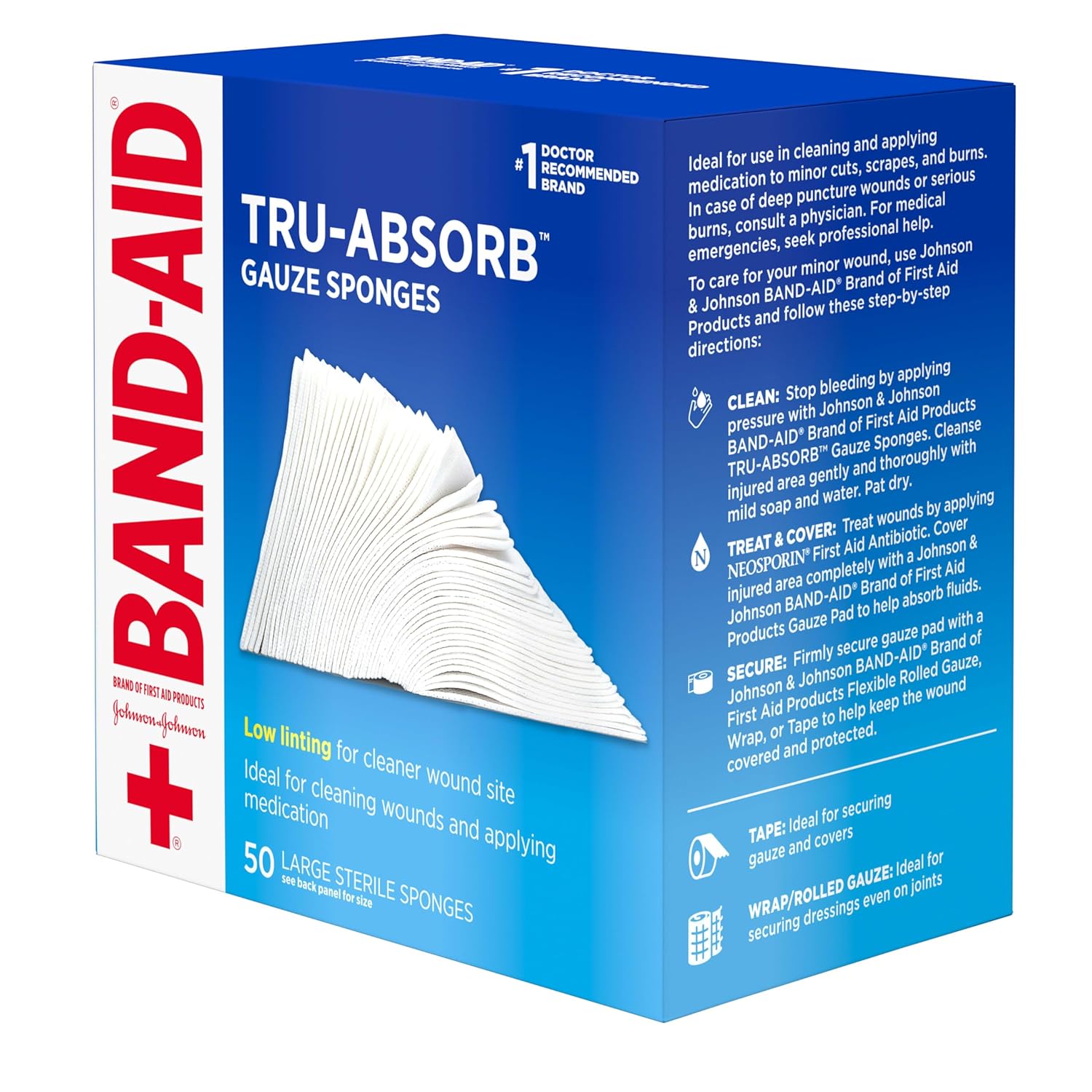 50-count package of Large BAND-AID Brand of First Aid Products Tru-Absorb Sterile Gauze Sponges for minor wound care. Use absorbent gauze pads for cleaning and applying medication to minor wounds, cuts, and burns