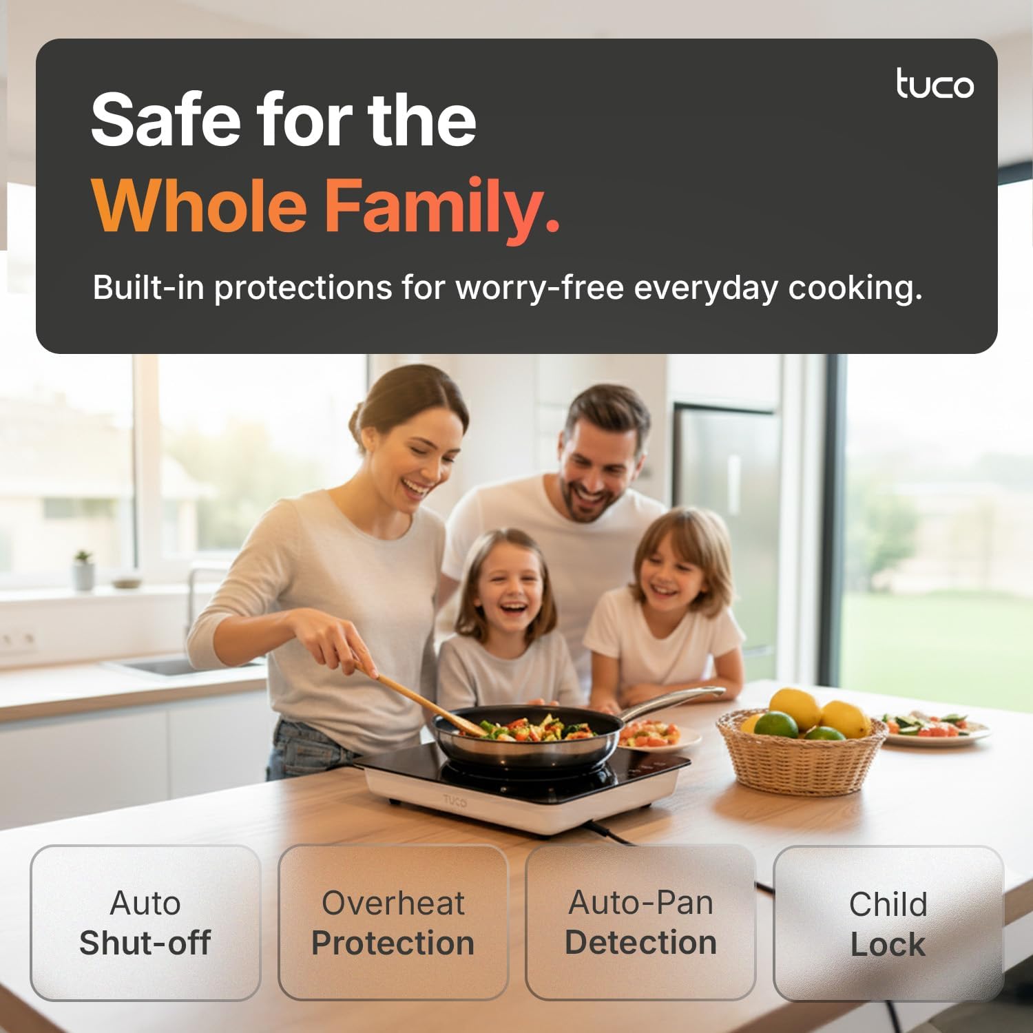 ⚠️ SMART SAFETY ACTIVATION – PAN REQUIRED: The TUCO Induction Cooktop only activates when compatible cookware is placed on the surface, preventing accidental heating and improving safety. Induction technology heats cookware directly — if a magnet sticks to the bottom of the pan, it’s compatible.