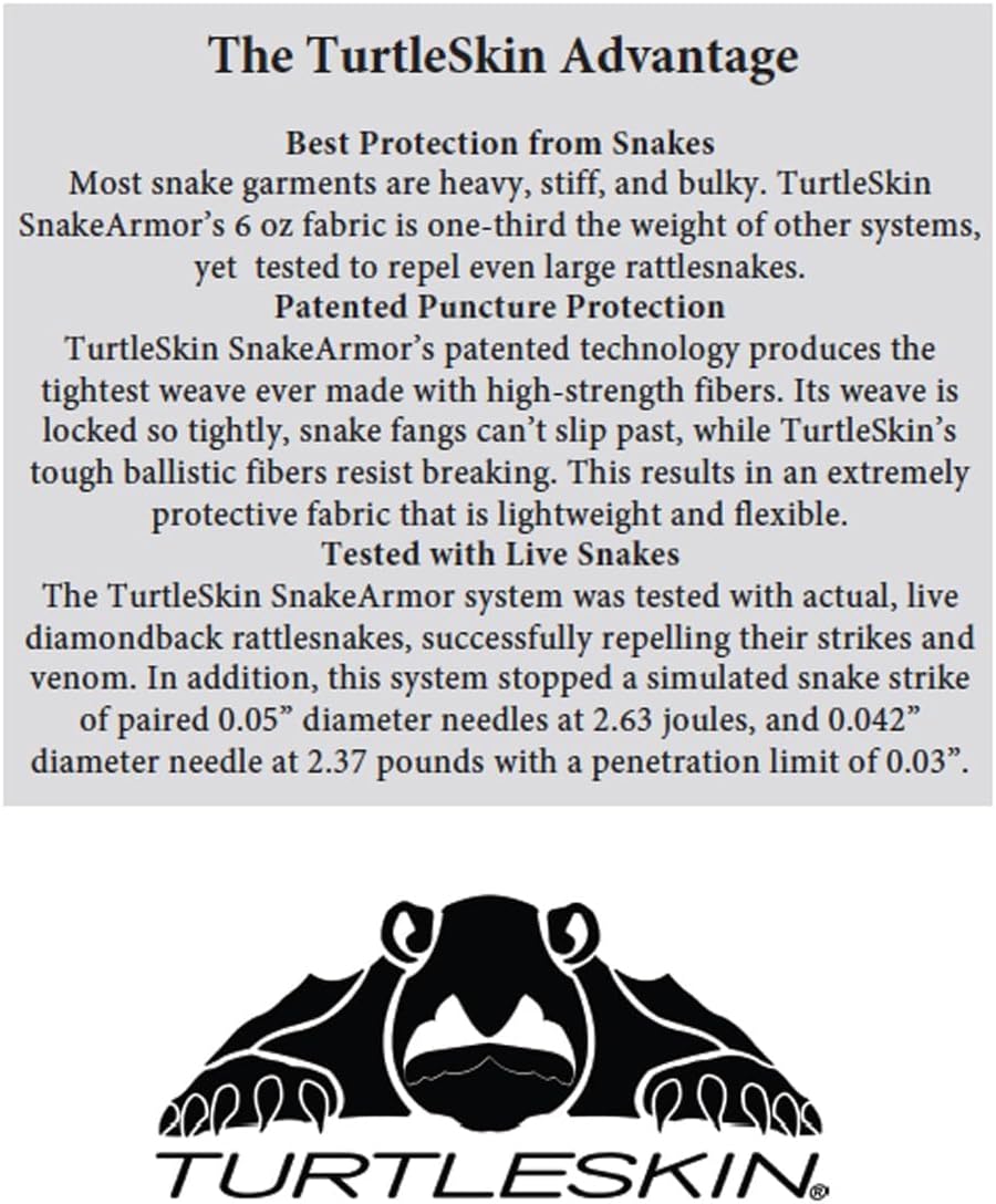 TurtleSkin SnakeArmor Snake Gaiters are constructed from a super-tight patented weave of high-strength ballistic fibers and polyester. Most snake gaiters are heavy, stiff, and bulky. Weighing less than 6 ounces each, these gaiters are one-third the weight of other snake gaiters, yet are tested to repel even large rattlesnakes.