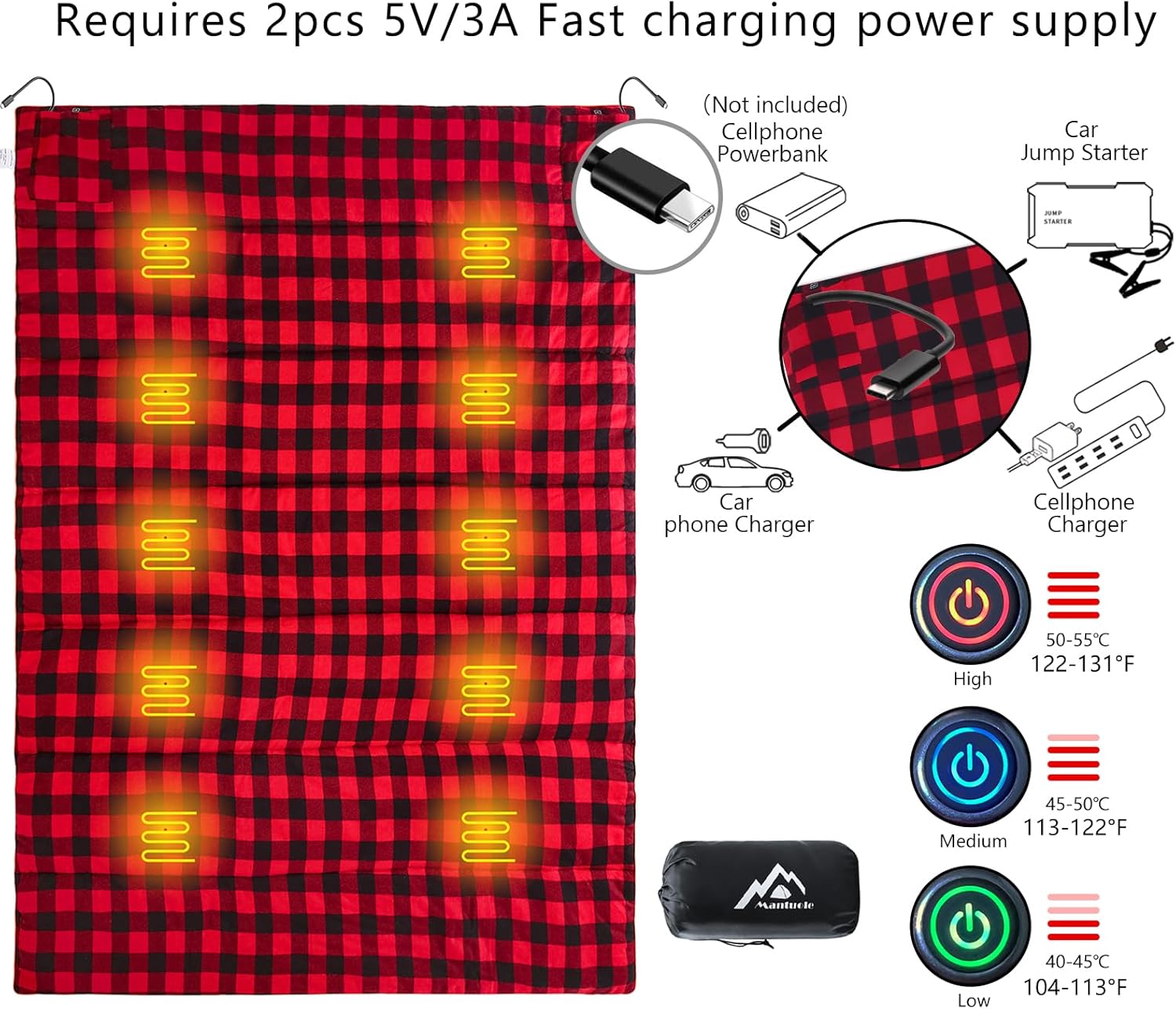 Major Features 5 Pcs+5PCS Built-in Heating pads warm the sleeping bag. Compatible with any 5V/3A Type C power supplies . Large size 6‘3“X4’7”. fits Adults Queen size sleeping bag. Durable polyester shell and soft flannel lining. Light weight, Easy to be carried around. Can be used in many places.