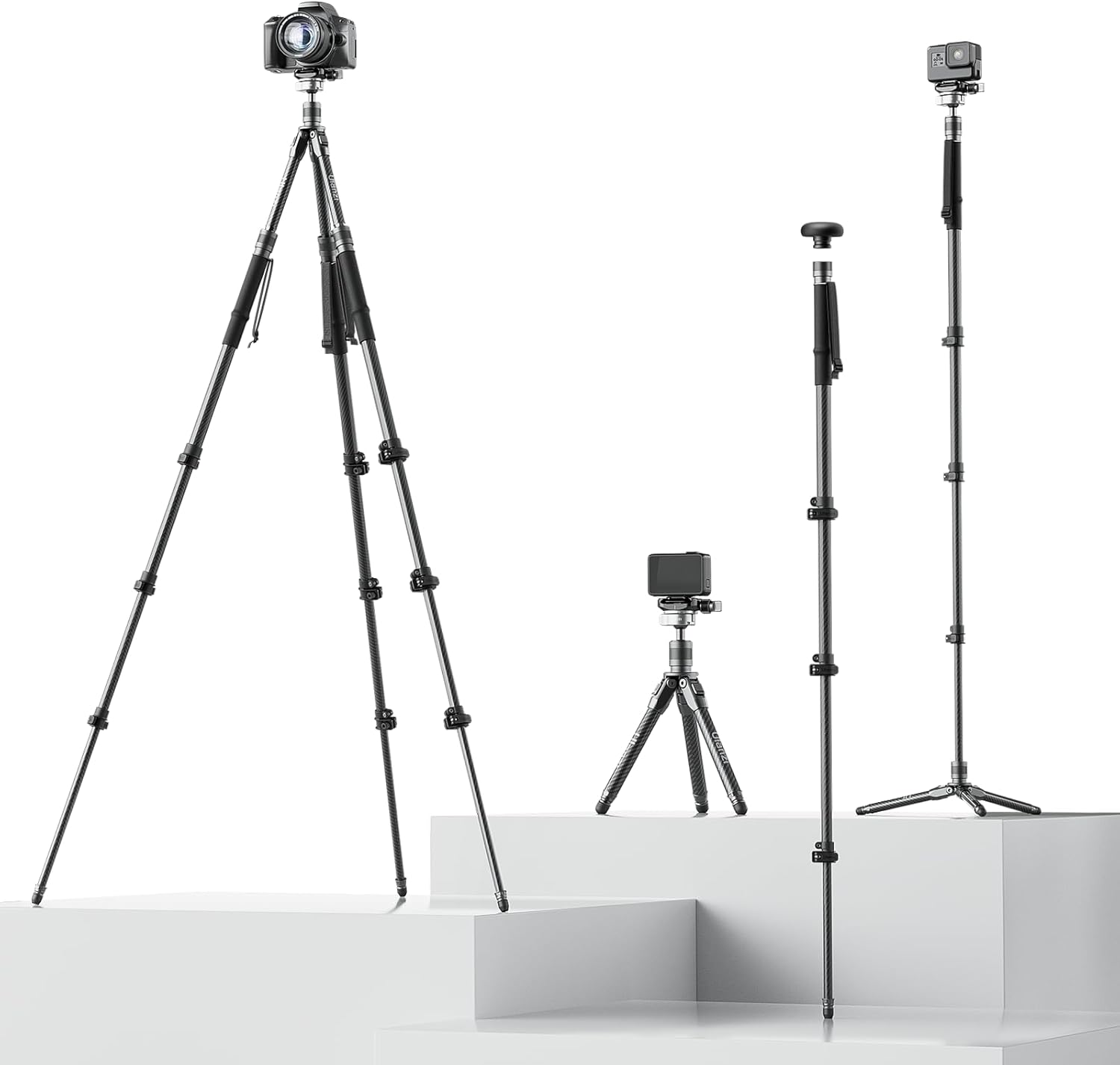 【5-in-1 Multifunctional Tripod】 This versatile tripod is designed to adapt to your photography needs. It effortlessly transforms into five different tools: a standard tripod, a walking stick, a selfie stick, a monopod, and a desktop mini tripod. Additionally, you can combine two tripods into an extension pole, perfect for simulating aerial shots or capturing smooth panning movements. This all-in-one design ensures you’re prepared for any shooting scenario.