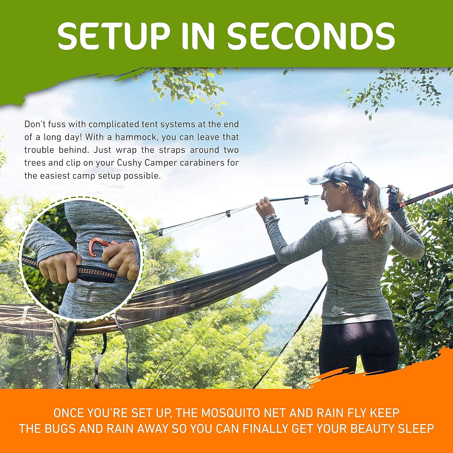 Everything You Need: The Cushy Camper Hammock System comes with everything you need for your portable outdoor shelter. We make sure this hammock set works to keep you covered, whether you’re sleeping under the stars or hiking down the trail.