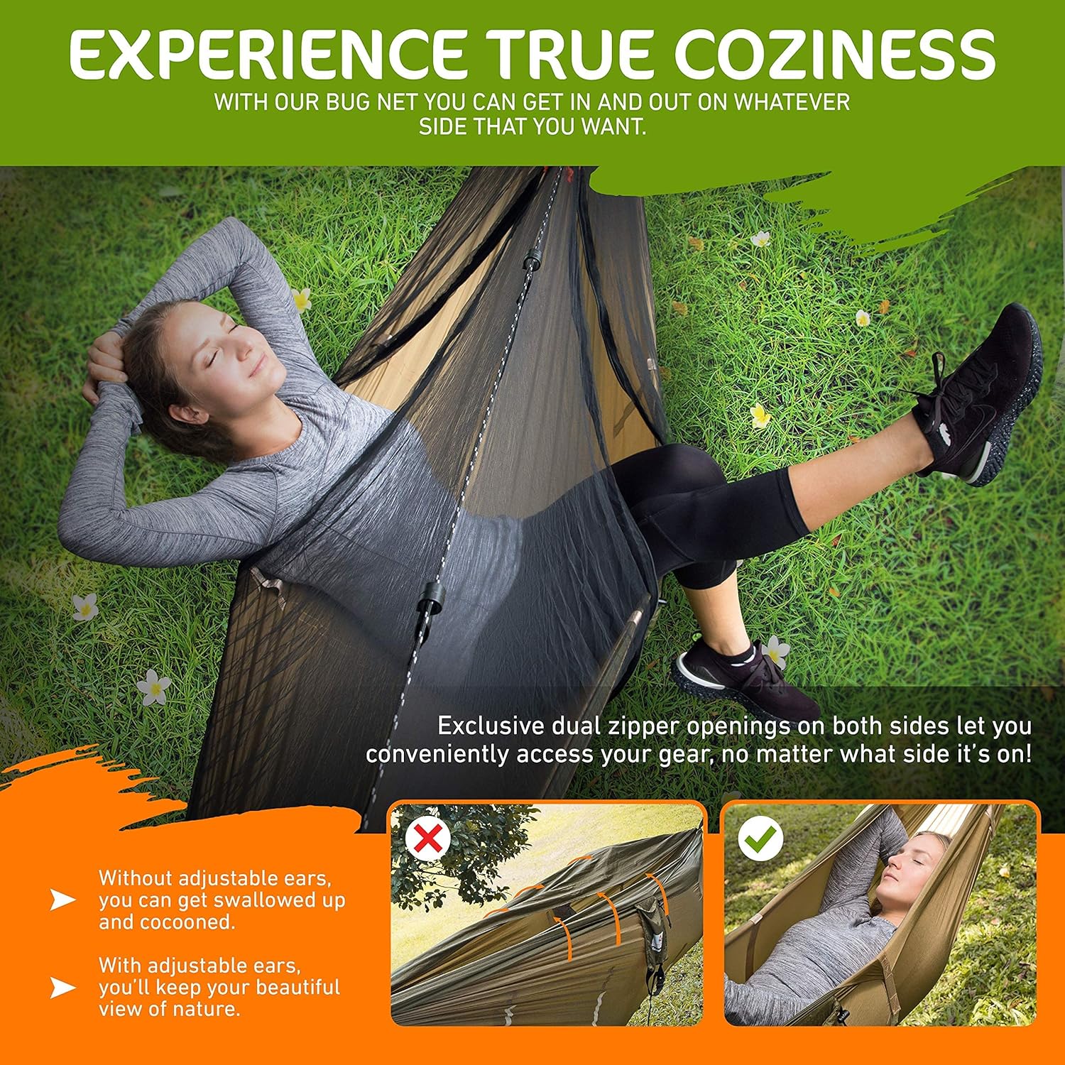 The bug net is perfect for outdoor adventures. Its ultra-fine mesh keeps out those annoying bugs while allowing airflow to keep you cool on hot nights. Unlike heavier meshes, it allows you to see through it so you can admire nature while the mosquitoes go hungry.