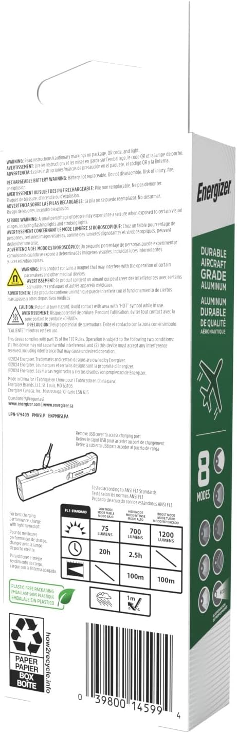 PORTABLE FLASHLIGHT: One Energizer 1200SL-R Rechargeable LED Flat Flashlight, a slim flashlight that offers powerful brightness in a portable and unique form factor