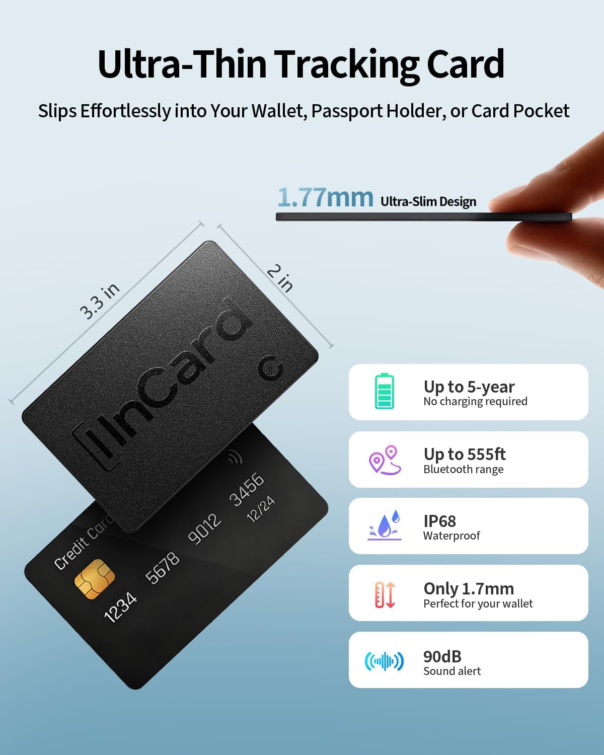 Credit-Card Thin & Discreet: Ditch bulky trackers. At just 1.7mm thin—slim as 3 credit cards—it slides smoothly into your wallet, passport holder, or document sleeve—no bulk, no hassle.
