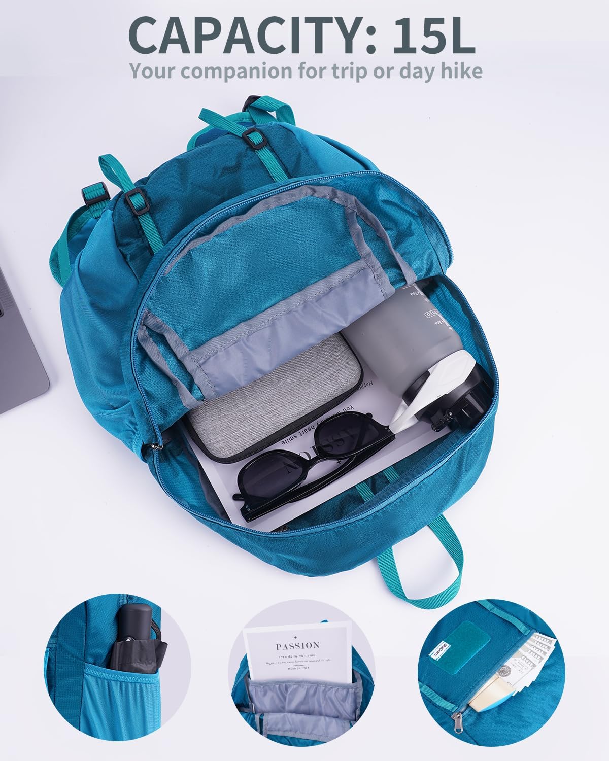 【Gear Attachment Points】The bottom of the foldable backpack has loops for trekking poles, and the front is loaded with attachment points for essentials like a compass, bug repellent light, flashlight, or even a small stuffed animal.