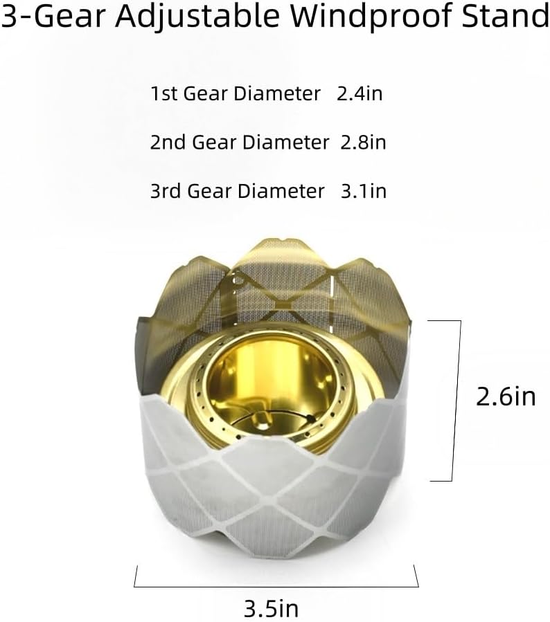 Efficient Windproof Heating Design The included stainless steel windscreen effectively blocks outdoor wind interference, preventing reduced heating efficiency caused by flame wobble. When paired with the alcohol stove stand, it stably supports the alcohol camping stove, ensuring concentrated flames and faster heating. Even in complex windy outdoor conditions, it can efficiently complete cooking or water-boiling tasks.