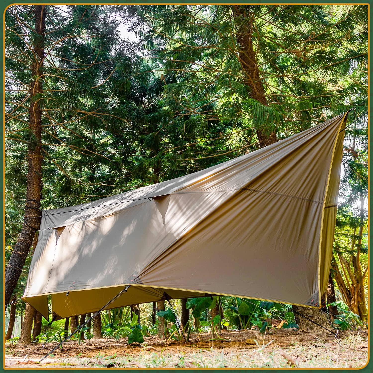 FREE COLLOCATION: Wolfden Tarp can be used with a camping hammock, or be used as a canopy to keep out the rain and the sun.
