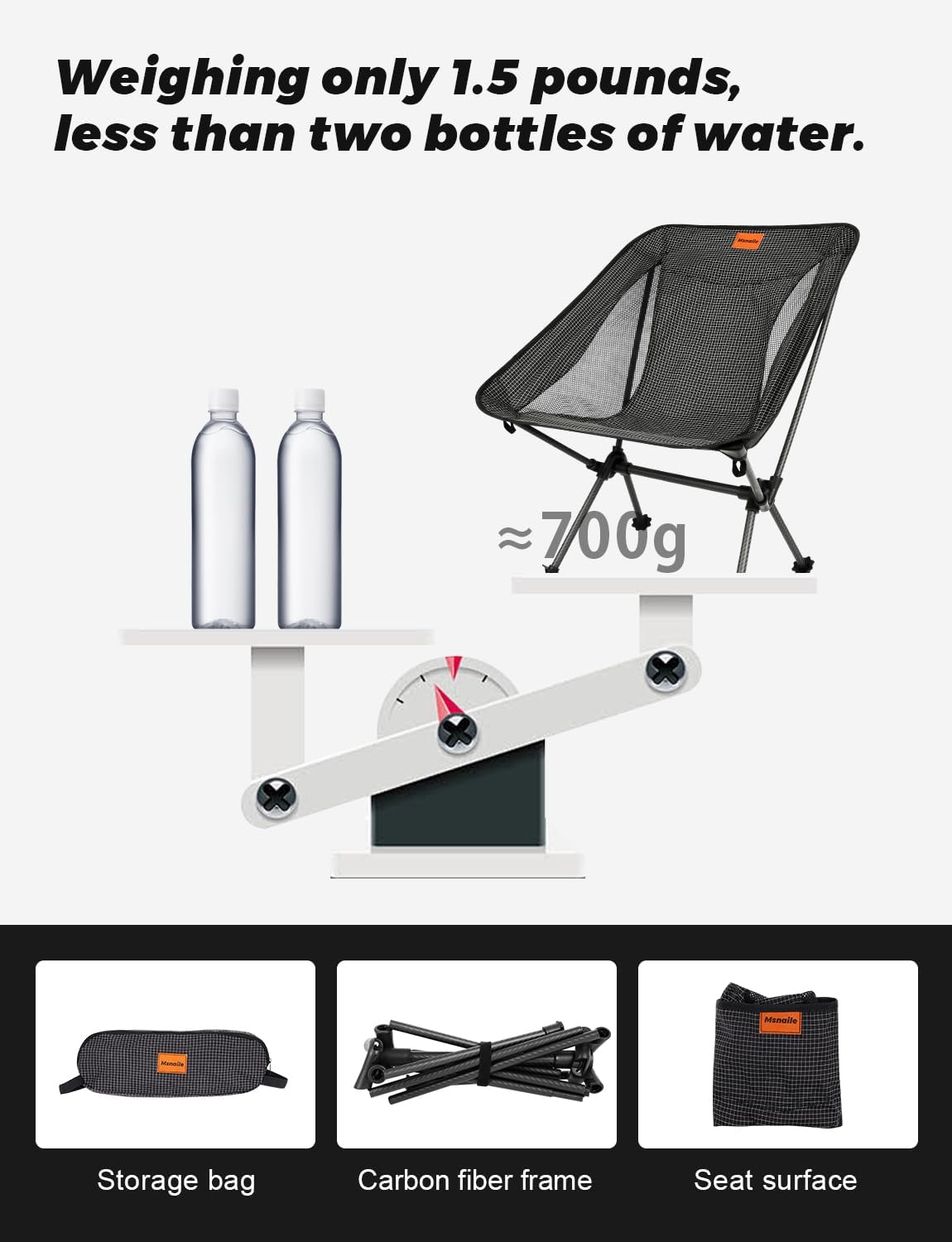 UltraLight & Compact Storage: Carbon fiber is 1/3 lighter than traditional aluminum alloy, and this ultralight camping chair weighs only 1.5 lbs (1.65 lbs including the storage bag). It comes with a storage bag made from the same Dyneema blend fabric, and when packed, the size is just 17×5×5 inches, making it easy to fit into a backpack for convenient carrying.