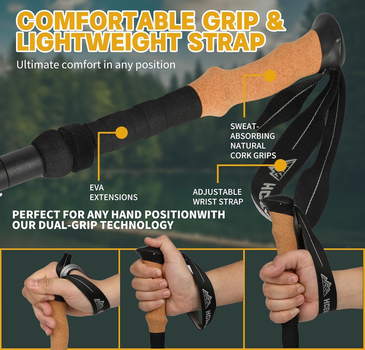 COMFORTABLE GRIP: Natural cork handle provides superior comfort and moisture-wicking properties for extended hiking sessions.