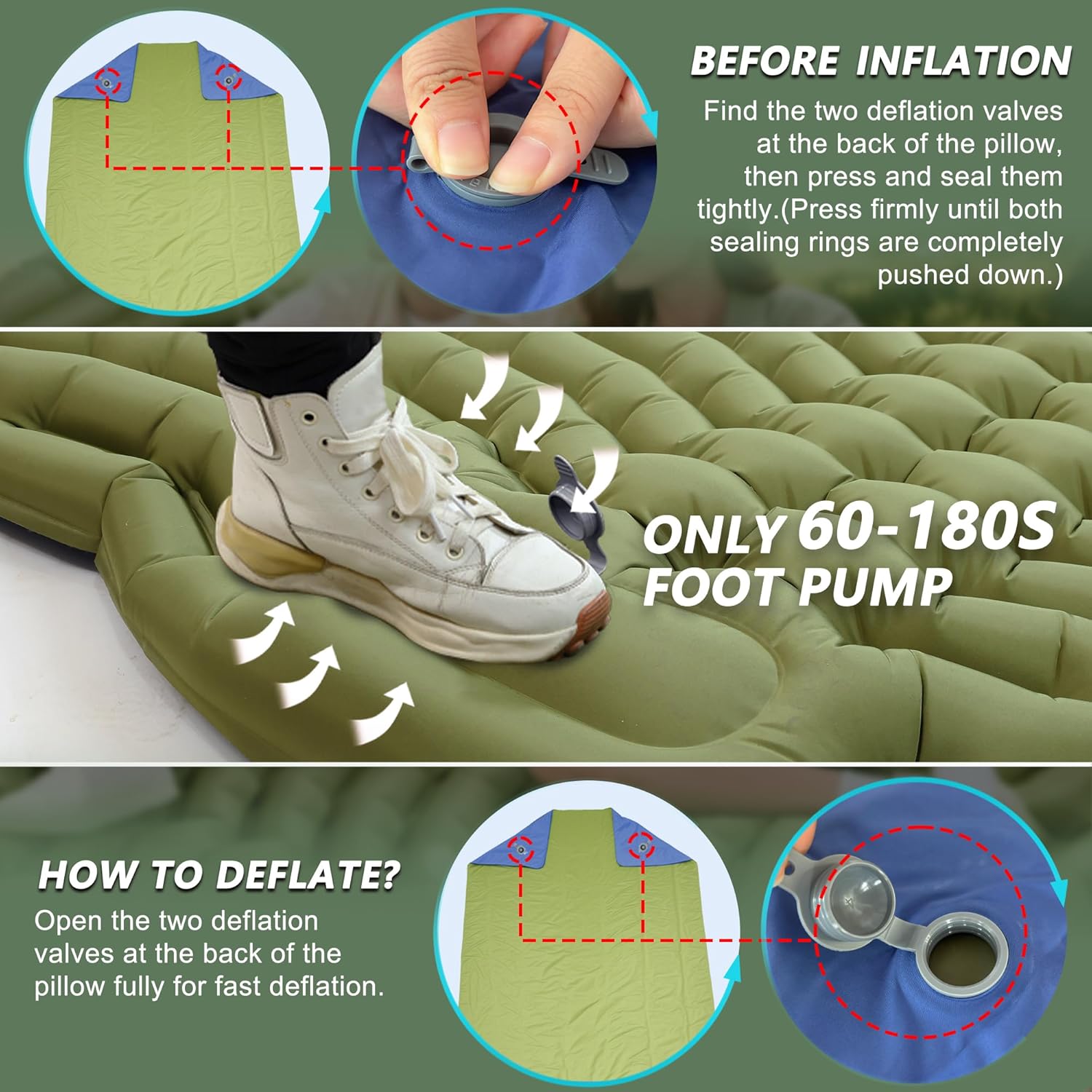 【Fast Foot Pump to Inflate & 1s Deflation】No need for hands, mouth, or a pump to inflate our self-inflating camping sleeping pad. Simply step on the built-in foot pump, and it will fully inflate in 1-3 minutes. Additionally, the two dual-layer valves on the pillow of the air mattress effectively prevent air leakage and allow for quick deflation. Note: Be sure to close the two valves on the back of the pillow before inflating.